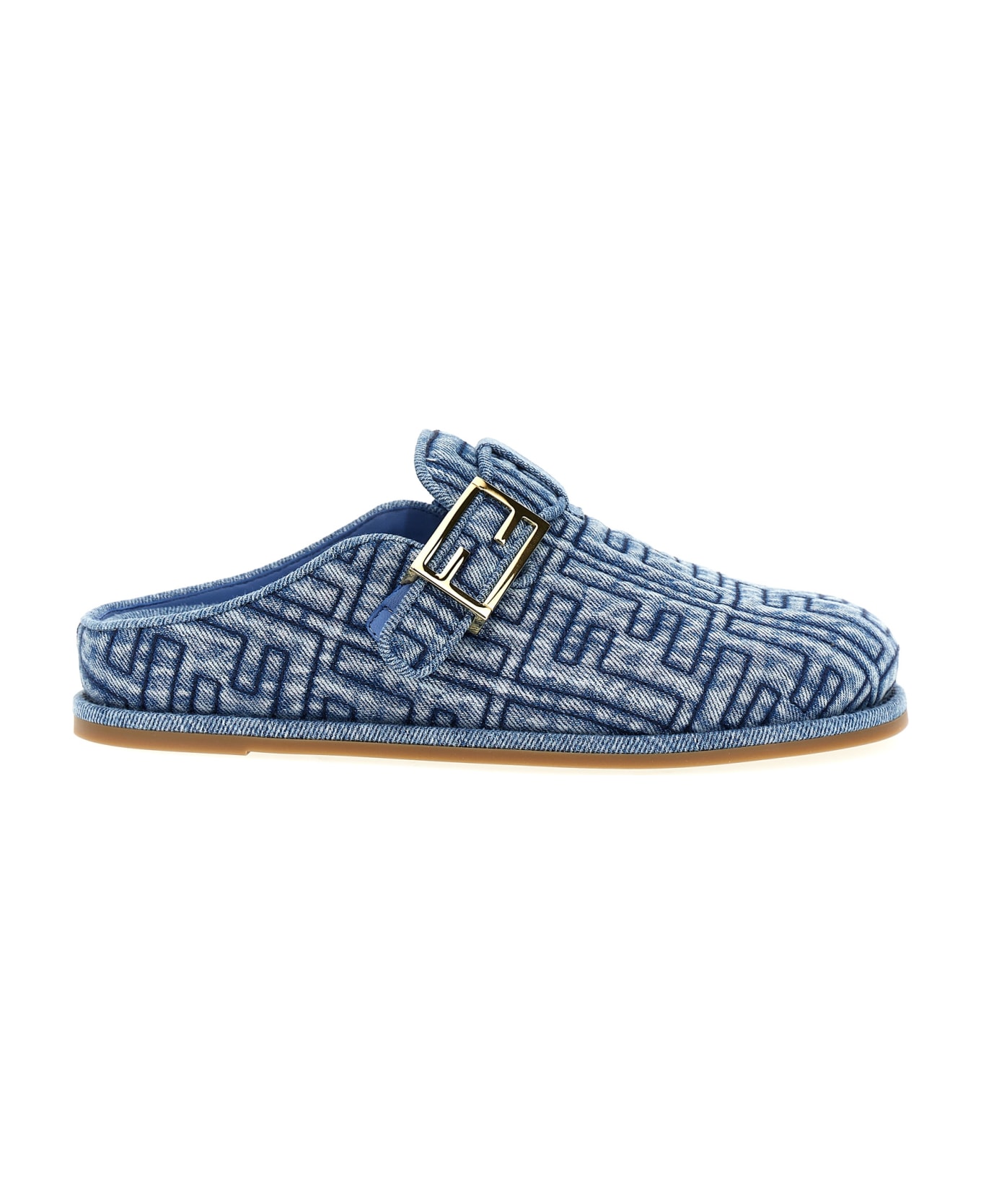 'Fendi Feel' mules in distressed denim with quilted FF pattern, metal logo plaque, rubber sole. Composition: 100% cotton