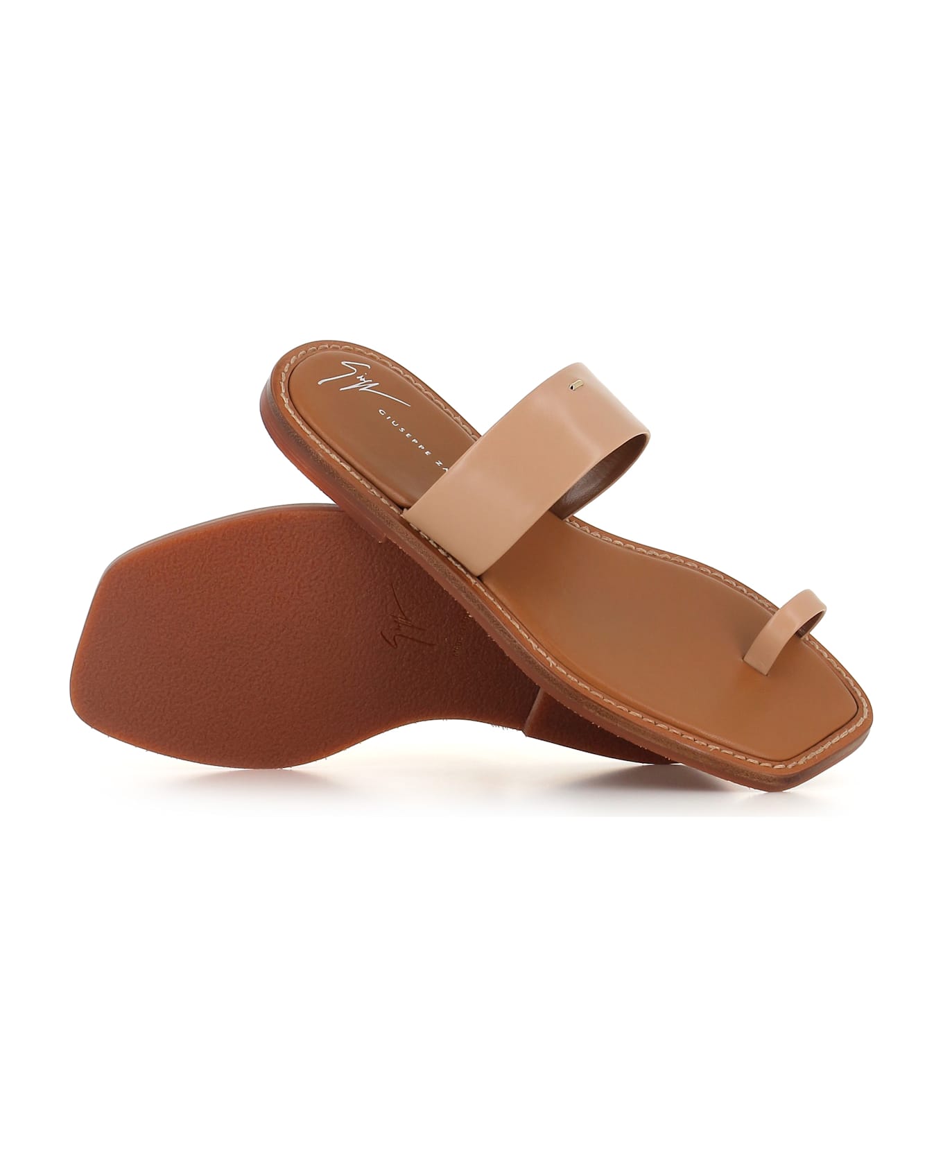 Powder-pink soft leather woman's flip-flops shoes by Giuseppe Zanotti, featuring a padded insole and a square toe. Lined interior. Leather upper with a rubber sole. Heel: 1,5 cm
