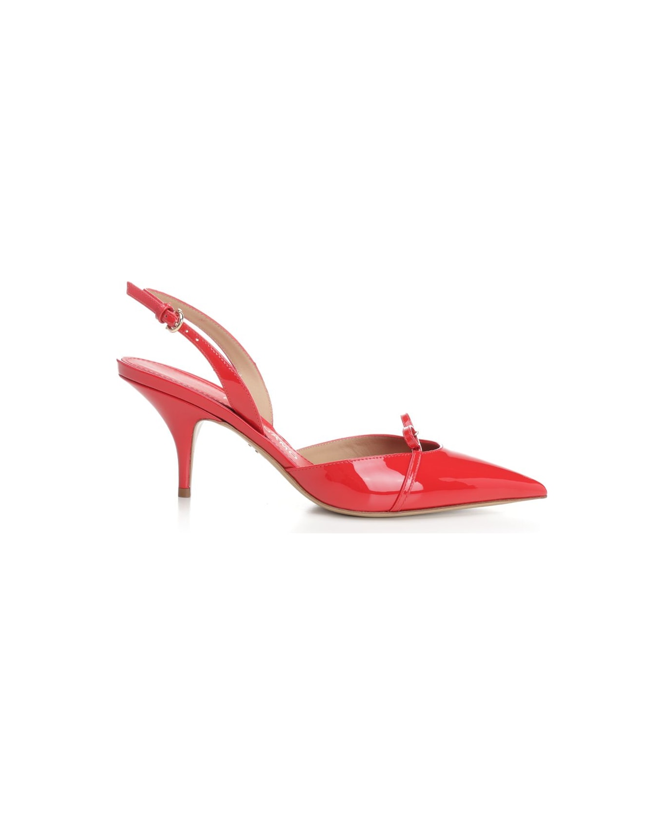 Red patent leather "Gylla 70" slingback by Ferragamo, pointed toe and bow under the heel with mini gold plaque. Composition: UPPER : 100% PATENT CALF LINING:100% GOAT (CAPRA HIRCUS NIGERIA RANCHED) SOLE: 100% BOS TAURUS