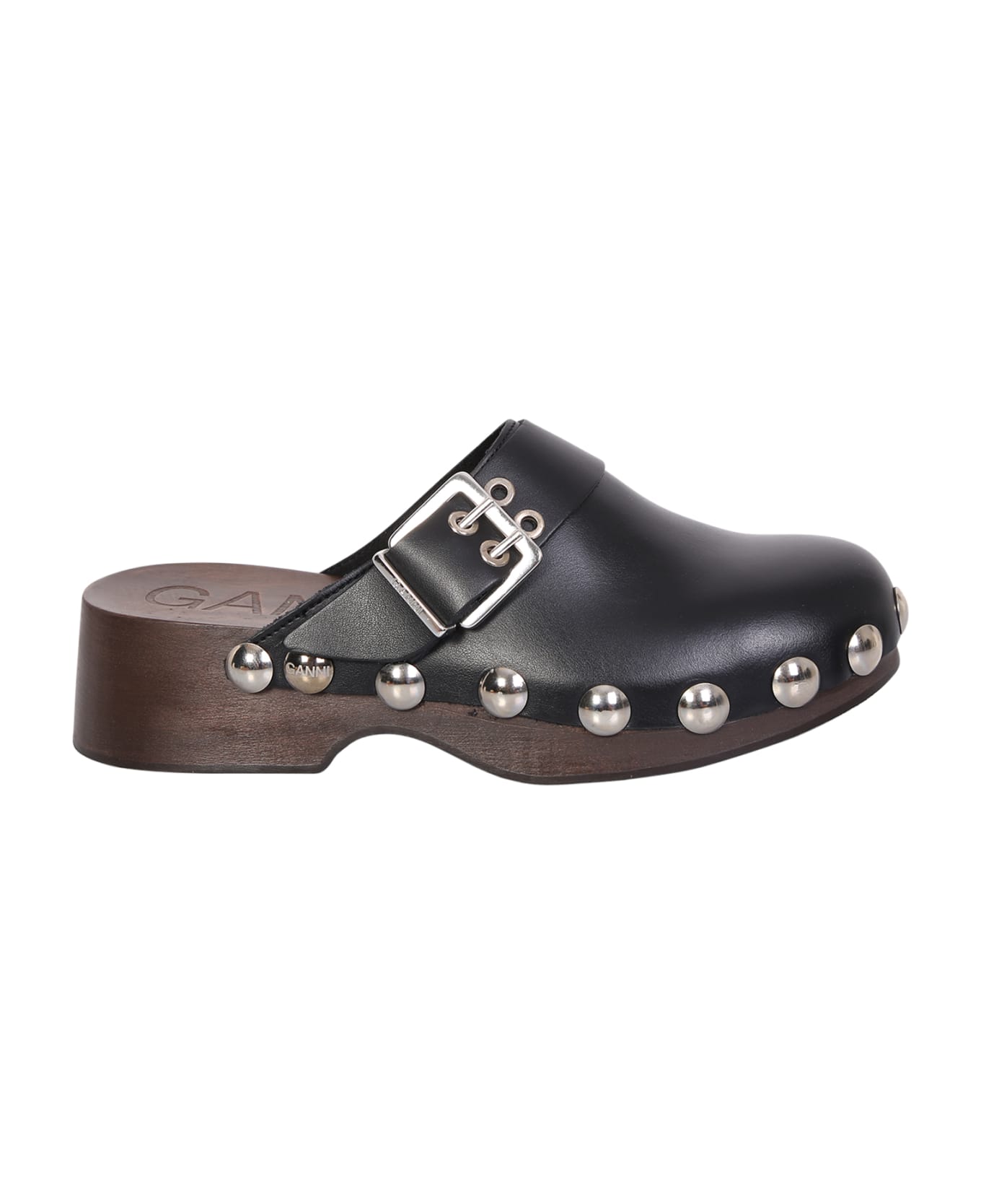 Round toe. Decorative buckle detail. Slip-on style. Silver-tone stud detail. Color: black