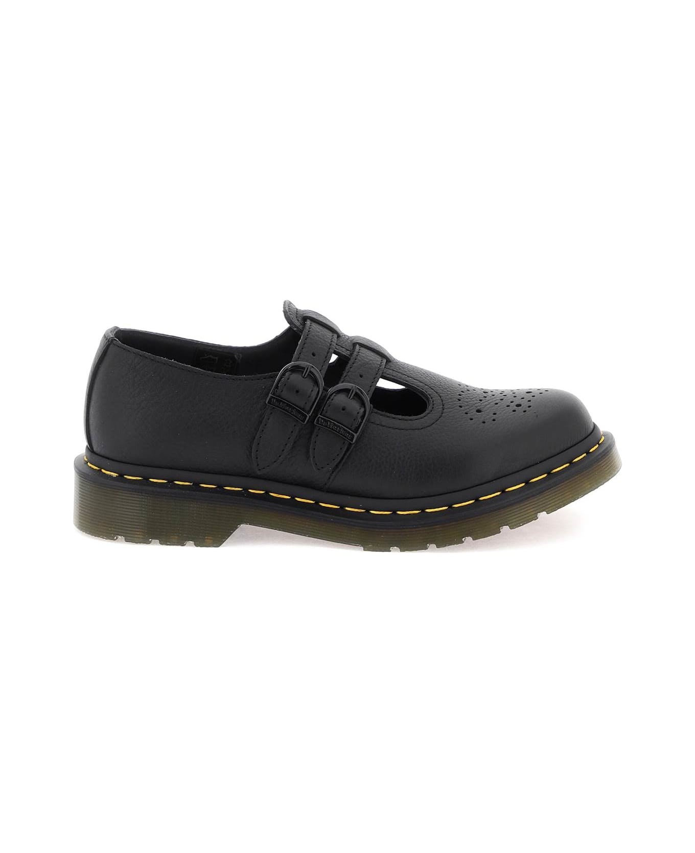 These Mary Jane Dr. Martens are made of Virginia leather with perforated toe and straps featuring enamel-coated metal buckles in matching tone. The interior is lined with leather and has a removable insole, while the sole is made of rubber. Composition: 100% leather