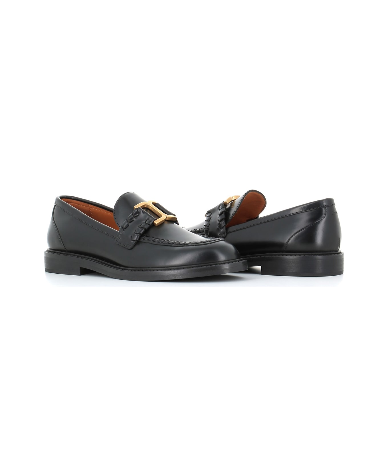 Black brushed calfskin classic loafer from Chloé, featuriong by woven details, gold-plated trim with Chloé engraving, tone-on-tone stitching and an almond toe. Leather sole. Lined interior. Heel: 2,5 cm Composition: Leather