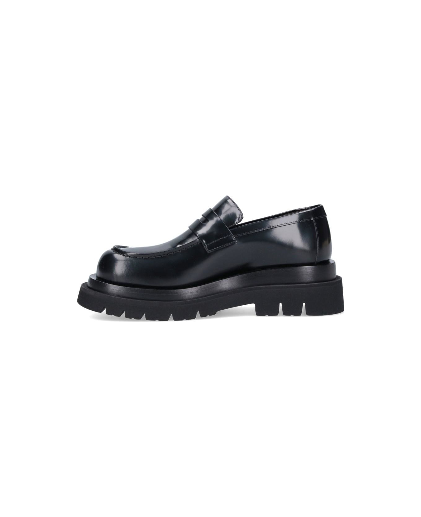 Bottega Veneta 'Lug' loafers in black leather with round toe, slip-on fit, and maxi rubber sole.