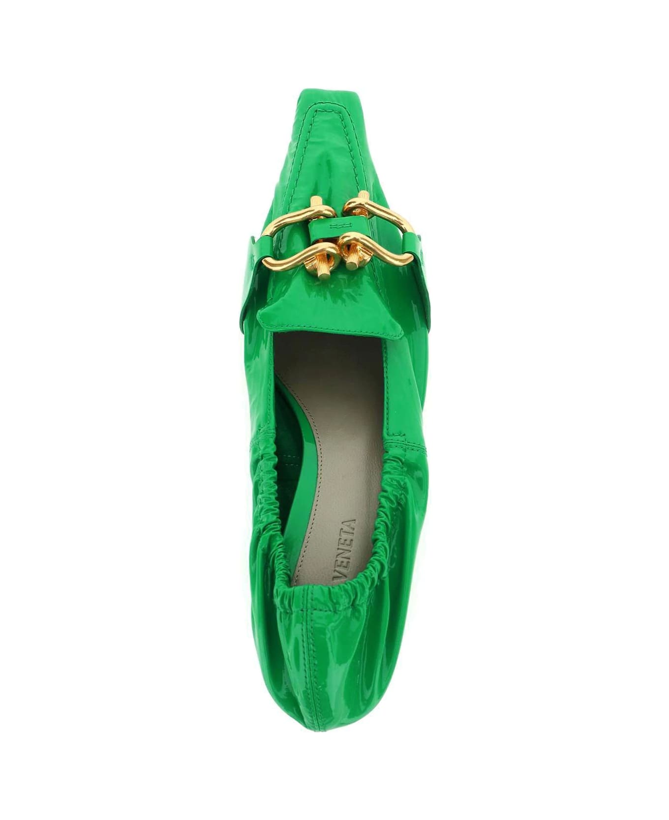 Madame pumps by Bottega Veneta made of patent leather with elastic back and gold metal detail on the front. Suede lining with leather footbed and leather sole.