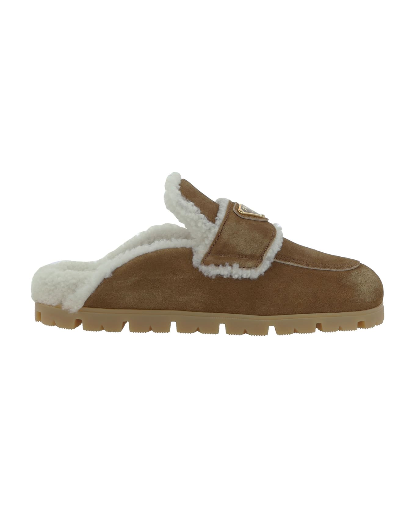 Leather mules by prada, contrasting soft shearling lining, front tray embellished with iconic triangular embossed applied plaque on front, open slip-on model on heel. Composition: 100% % Calf Leather Bos Taurus, 100% % Rubber