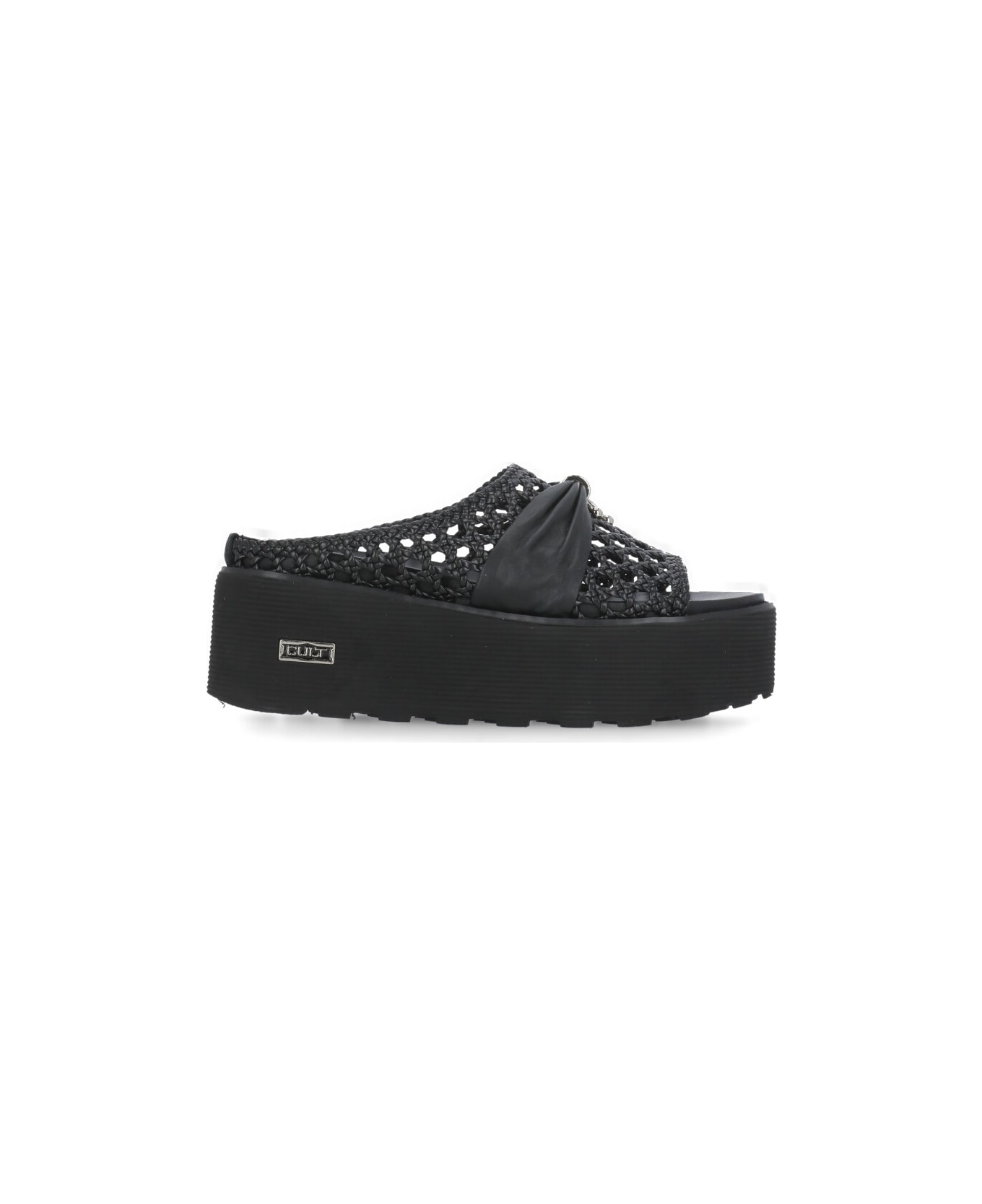 - Black Cult leather sandals for woman - One front band with metal detail - Contrasting colour logo at sole - All-over woven and perforated pattern - Raised sole (6,5 cm)