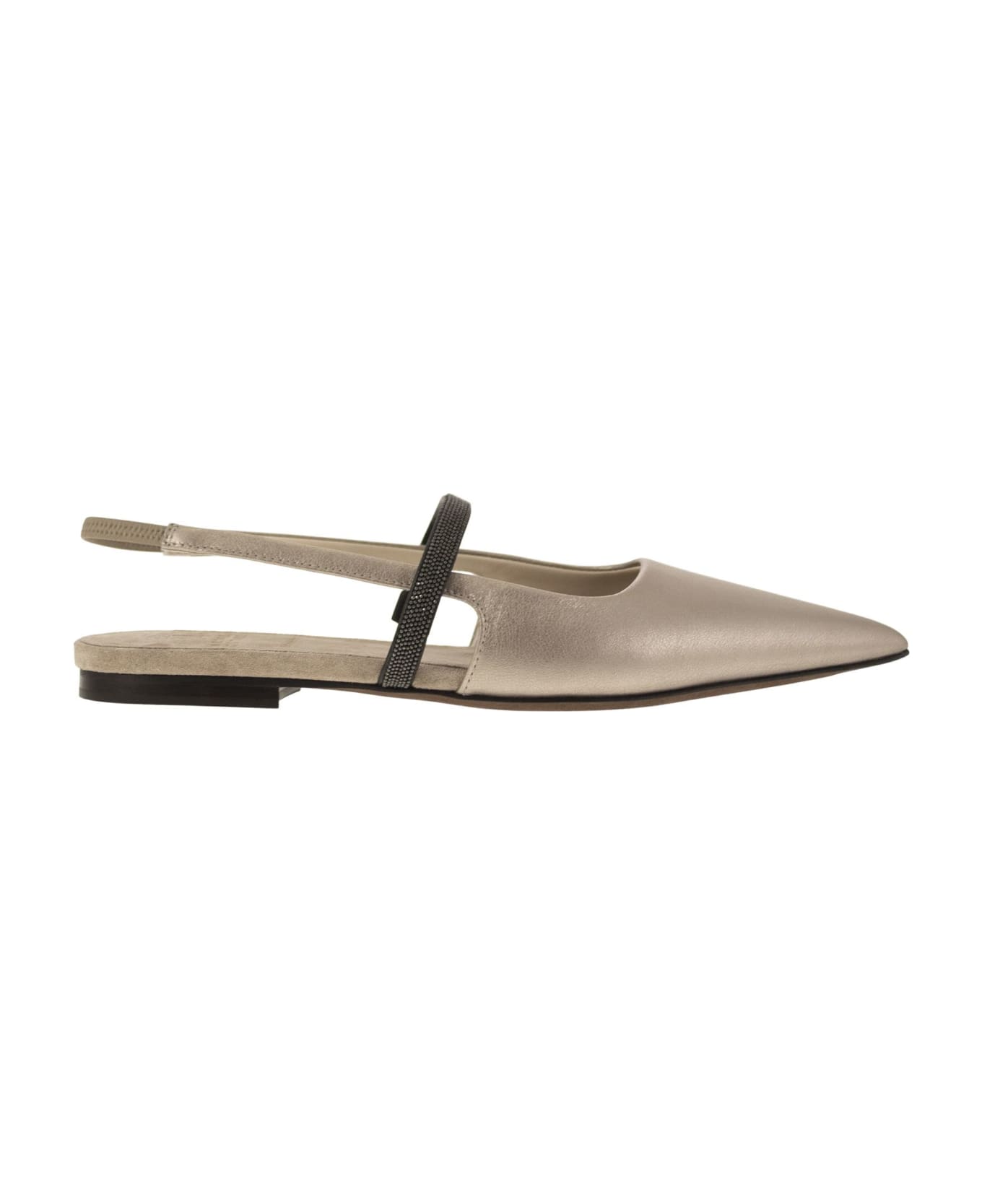 Fine materials and feminine details define the style of the flats. The tapered lines of the shoe are enriched by the special texture of the calfskin, characterised by a precious metallic effect. The thin band on the front embroidered with rows of shiny jewellery completes the shoe with the iconic decoration of the Brunello Cucinelli collections. - Leather lining - Leather sole - TPU non-slip rubber inserts on heel and toe - Nickel-free monile decoration DESIGNER ID: MZLMC2500 C9104 C. V. Composition: Upper: Metallic leather Lining: Leather Sole: Leather and Rubber