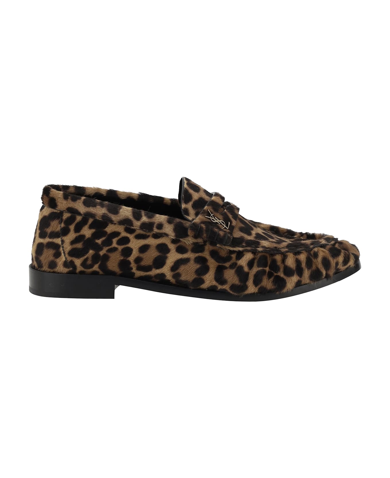 Saint laurent's ponyhair loafers are a bold and elegant style statement. with an eye-catching animal pattern, they feature an applied ysl plaque on the front for a distinctive brand touch. the round toe and leather block heel offer comfort and stability, while the branded insole completes the design with a classy detail. perfect for adding a luxurious accent to any look.