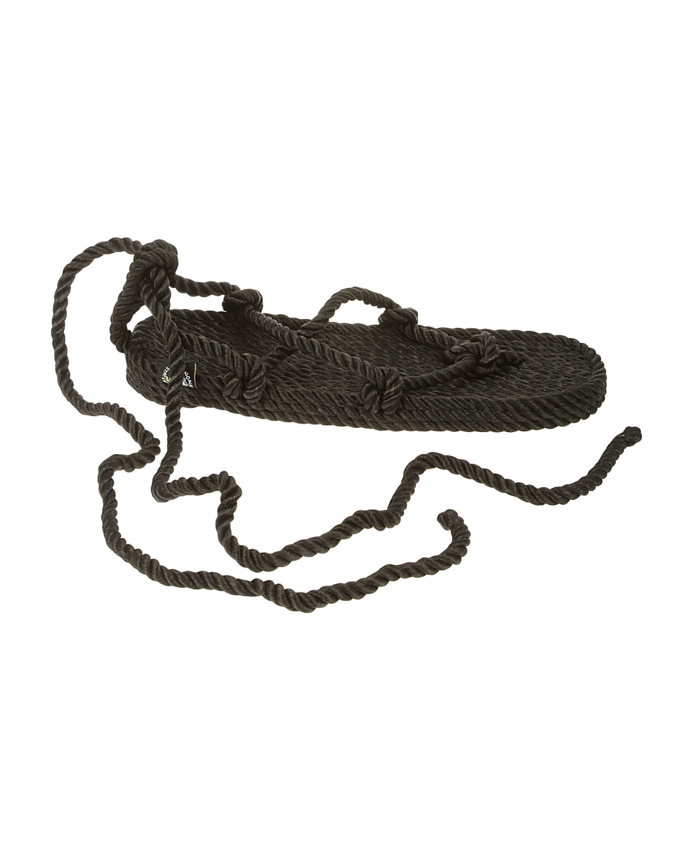 Nomadic State Of Mind Sandals with black braided cords, made with recycled plastic, thong model with cords to wrap and tie around the ankle, base and sole in rope.