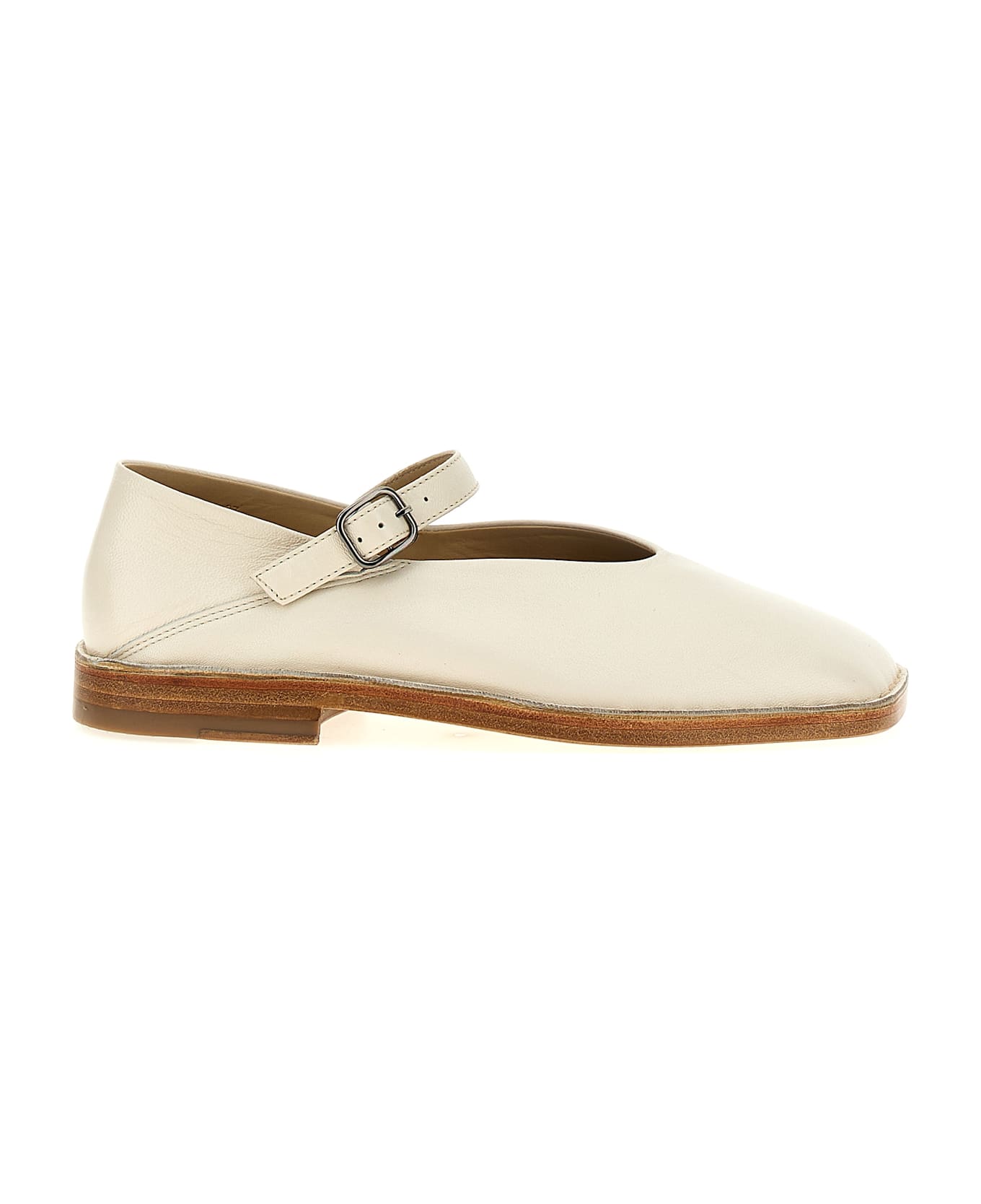 Leather ballet flats with square toe, adjustable strap, and leather sole.