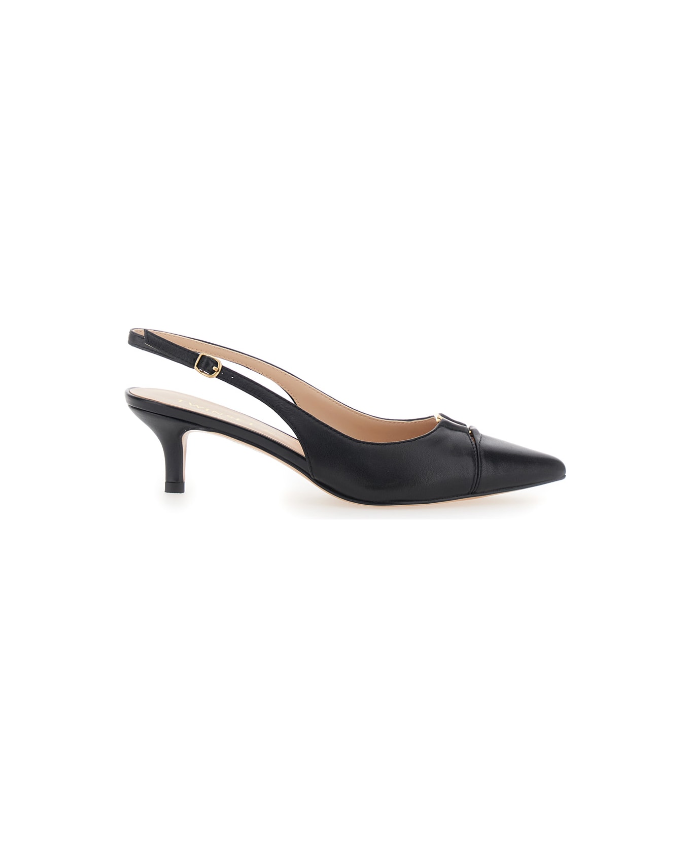 Pumps, Black, with pointed toe design. They feature a strap with closure and a low heel. The lining is made of leather and the logo is present on the insole. Gold-colored metalware. Made of leather.