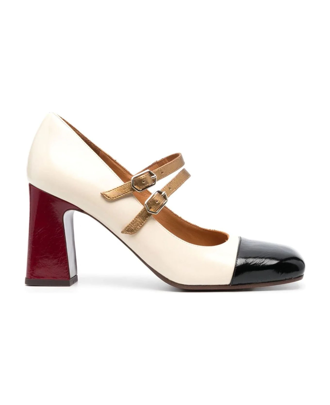Cream white, red and black calf leather pumps, smooth grain, patent finish, colour-block design, double-strap design, branded insole, square toe, side buckle fastening, high block heel