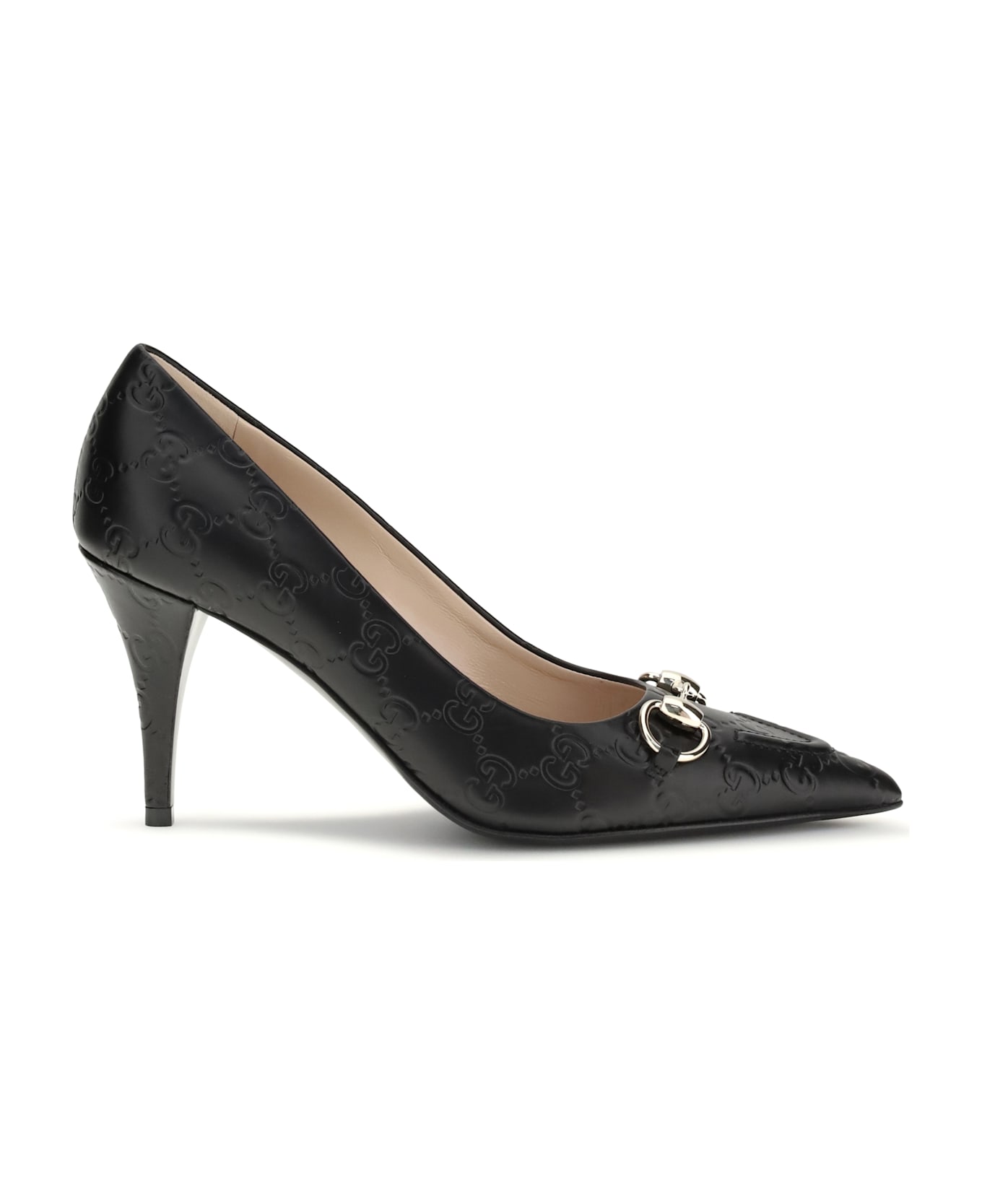 The horsebit pumps by gucci are crafted from black gg leather and accented with light gold-tone hardware, featuring the iconic horsebit embellishing the upper. the pointed toe, leather sole, and medium heel lend elegance and comfort, making this style refined and versatile.