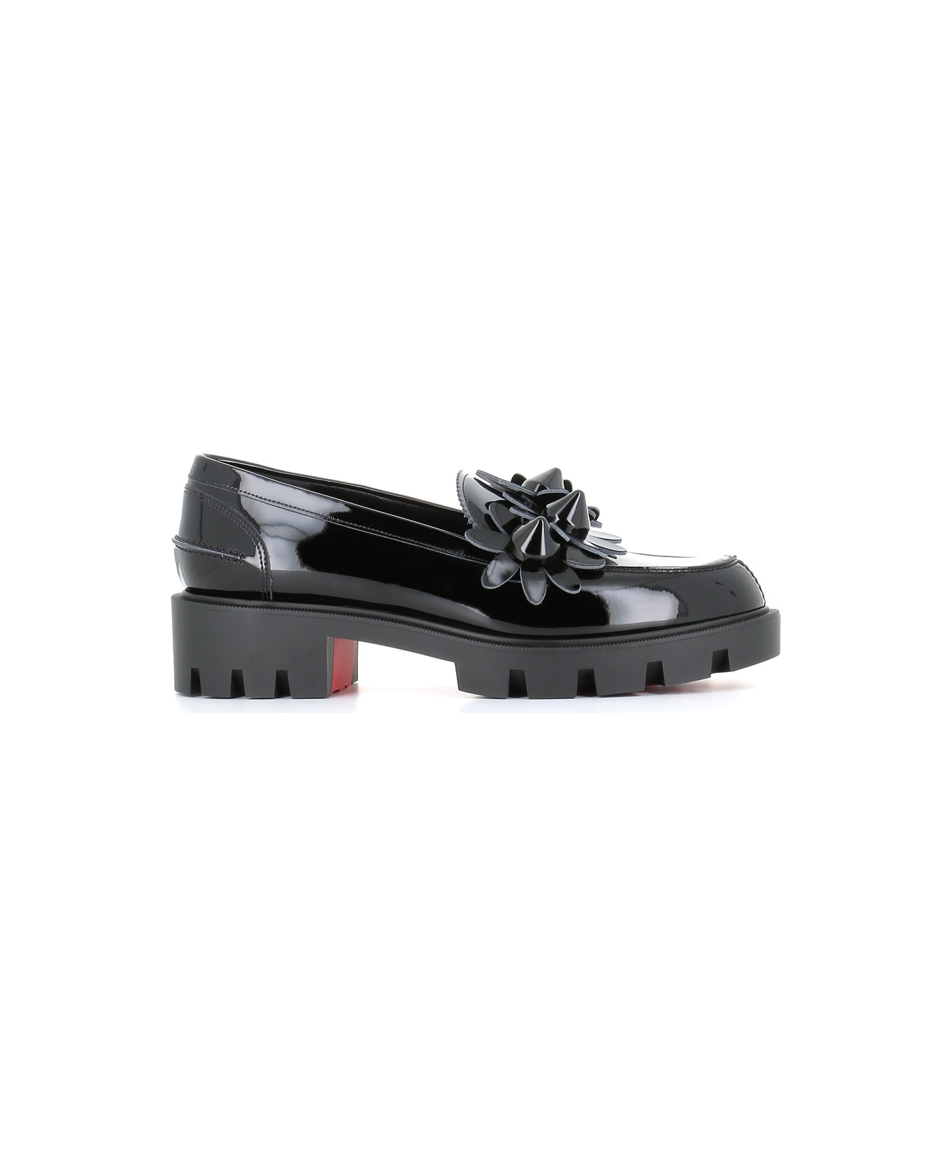 Black patent leather Loafer from Christian Louboutin, featuring by a round toe and a flowers with buckle tone-on-tone. High rubber sole. Lined interior. Heel: 4 cm