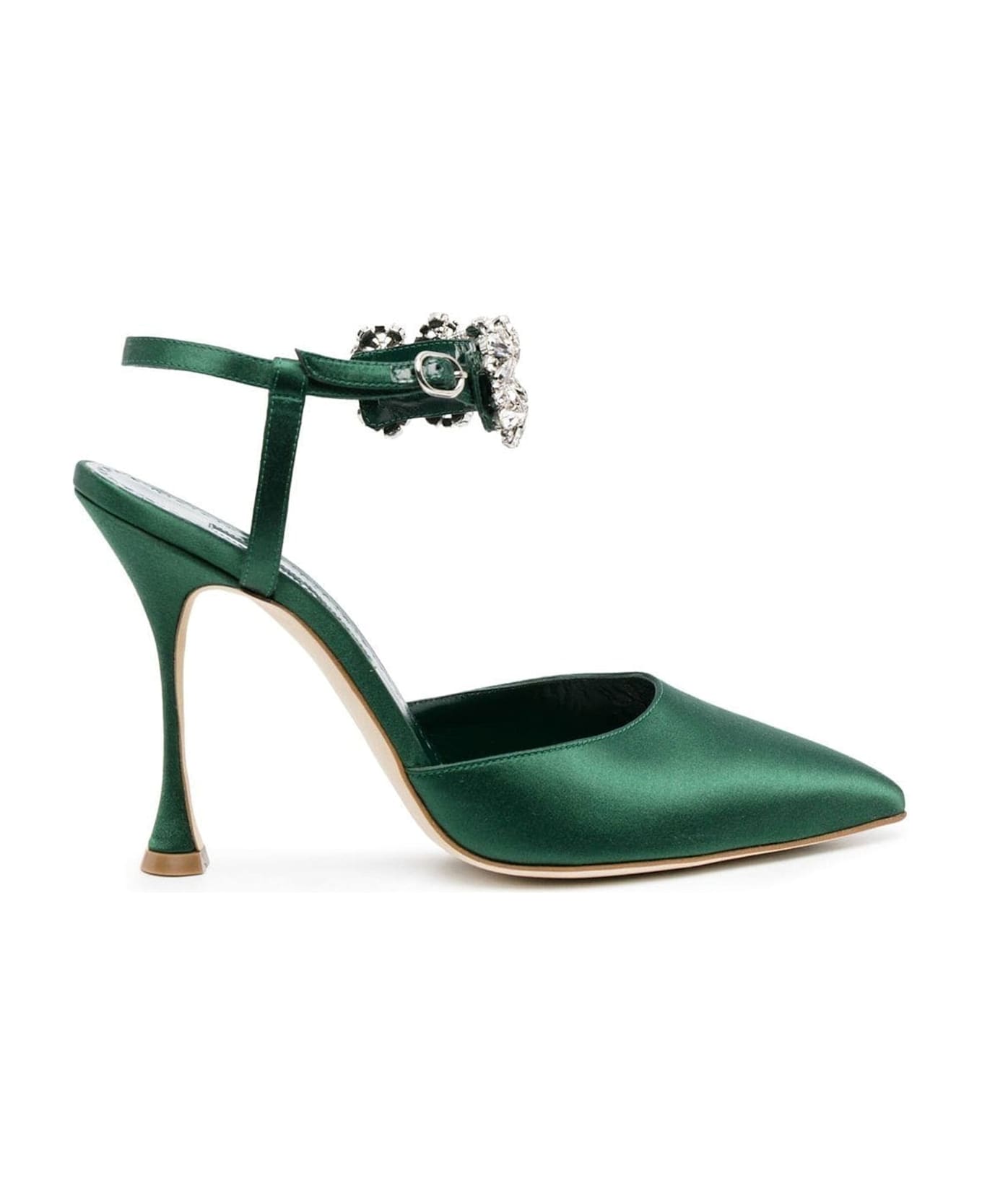 Composition: 100% silk Leather insole and sole Pointed toe Ankle side buckle fastening Crystal embellishments Heel 10,5 cm / 4,1 in Made in Italy