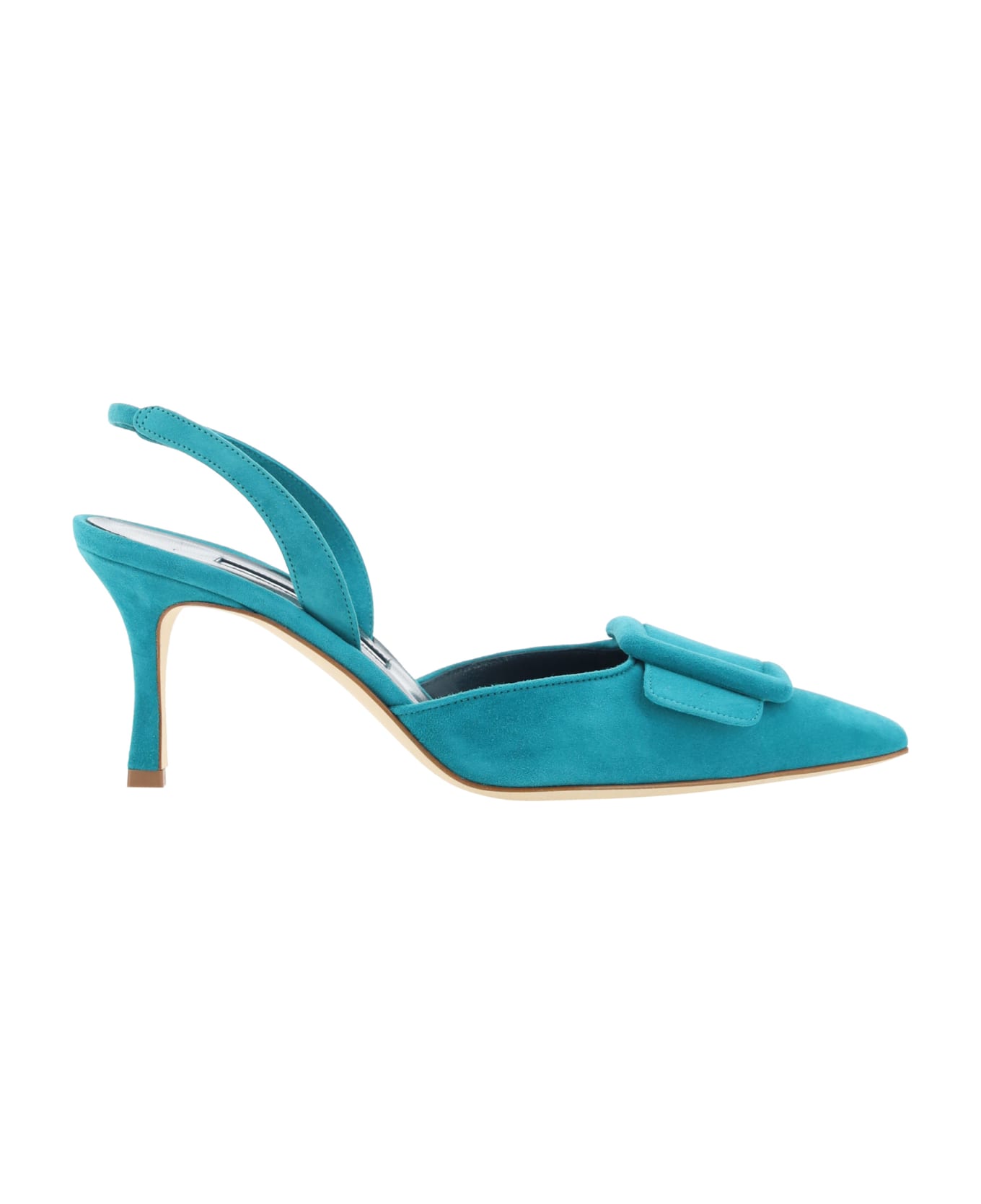 Leather maysli pumps by manolo blahnik featuring an almond toe, an embossed rectangular applique buckle on the front, a contrasting logo-embossed insole, a leather stiletto heel, and an elasticized slingback. Composition: 100% % Calf Leather Bos Taurus, 100% % Calf Leather Bos Taurus