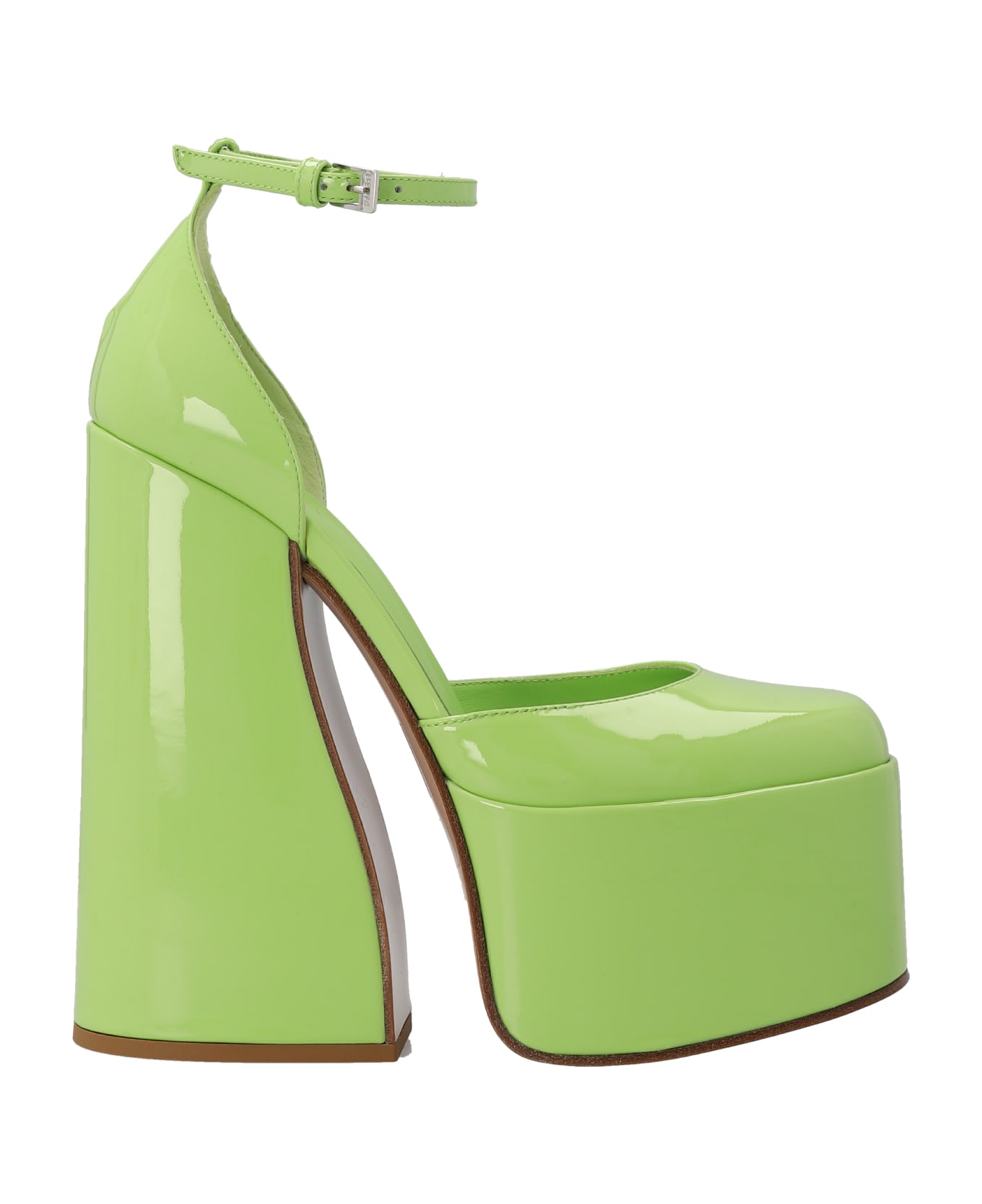 'Nikki Kabir' patent leather pumps with ankle strap, platform, chunky heel. ky heel.