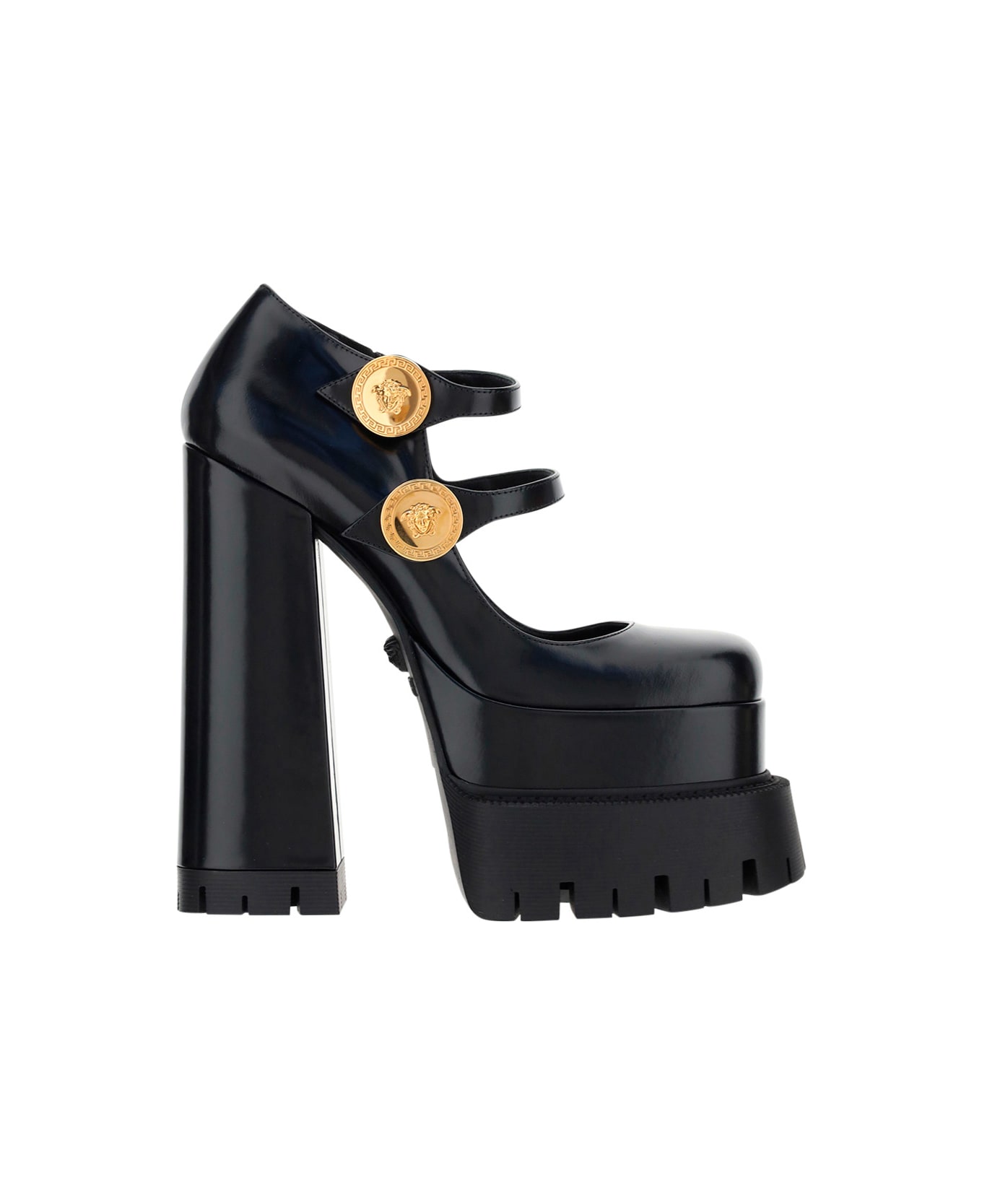Calfskin platform pumps by gianni versace, square toe, multi-layered rubber platform sole, leather chunky heel, ankle closure straps with gold-plated iconic medusa head brand logo, smooth leather design, logo insole.