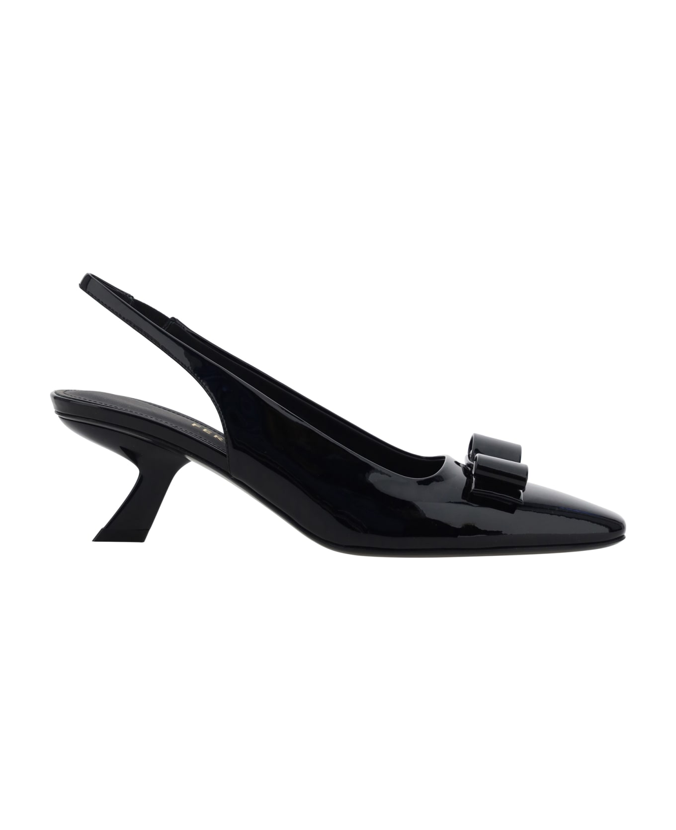 Calfskin pumps by ferragamo, geometric leather kitten heel, monochrome smooth leather design, elasticized slingback detail at back, bow embellished with iconic brand monogram plaque applied to front, elongated square toe on front, logo-embossed press-studded insole.