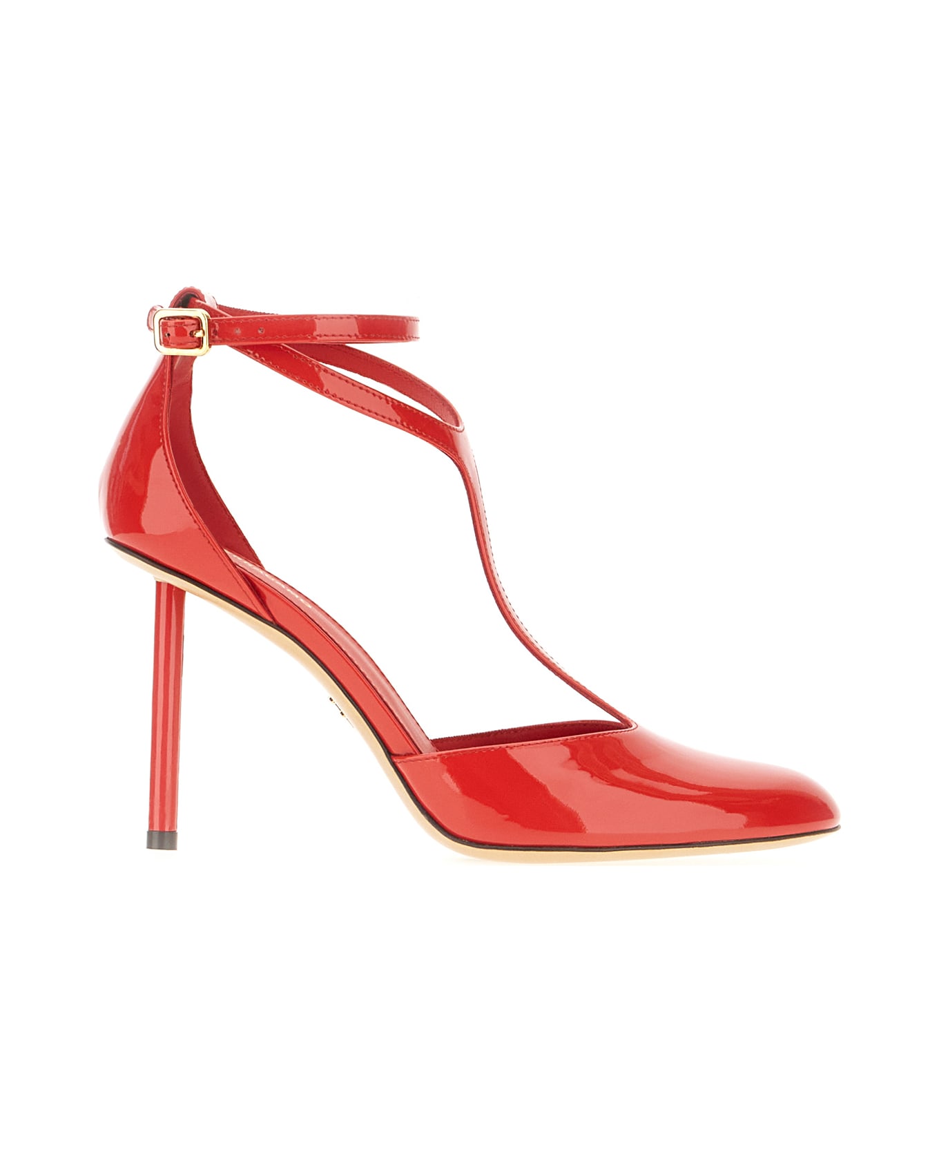 Pumps realized in patent calf leather. -Tonal leather ankle strap closure -Italian heel -Printed logo on the inside