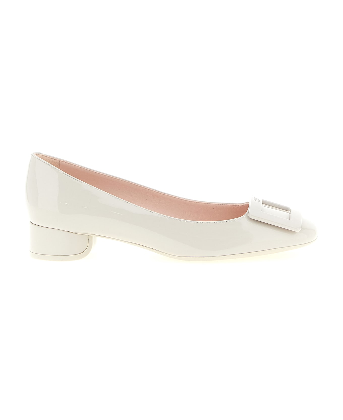 Patent leather pumps with square toe, enameled metal front buckle, Roundy heel, rubber sole.