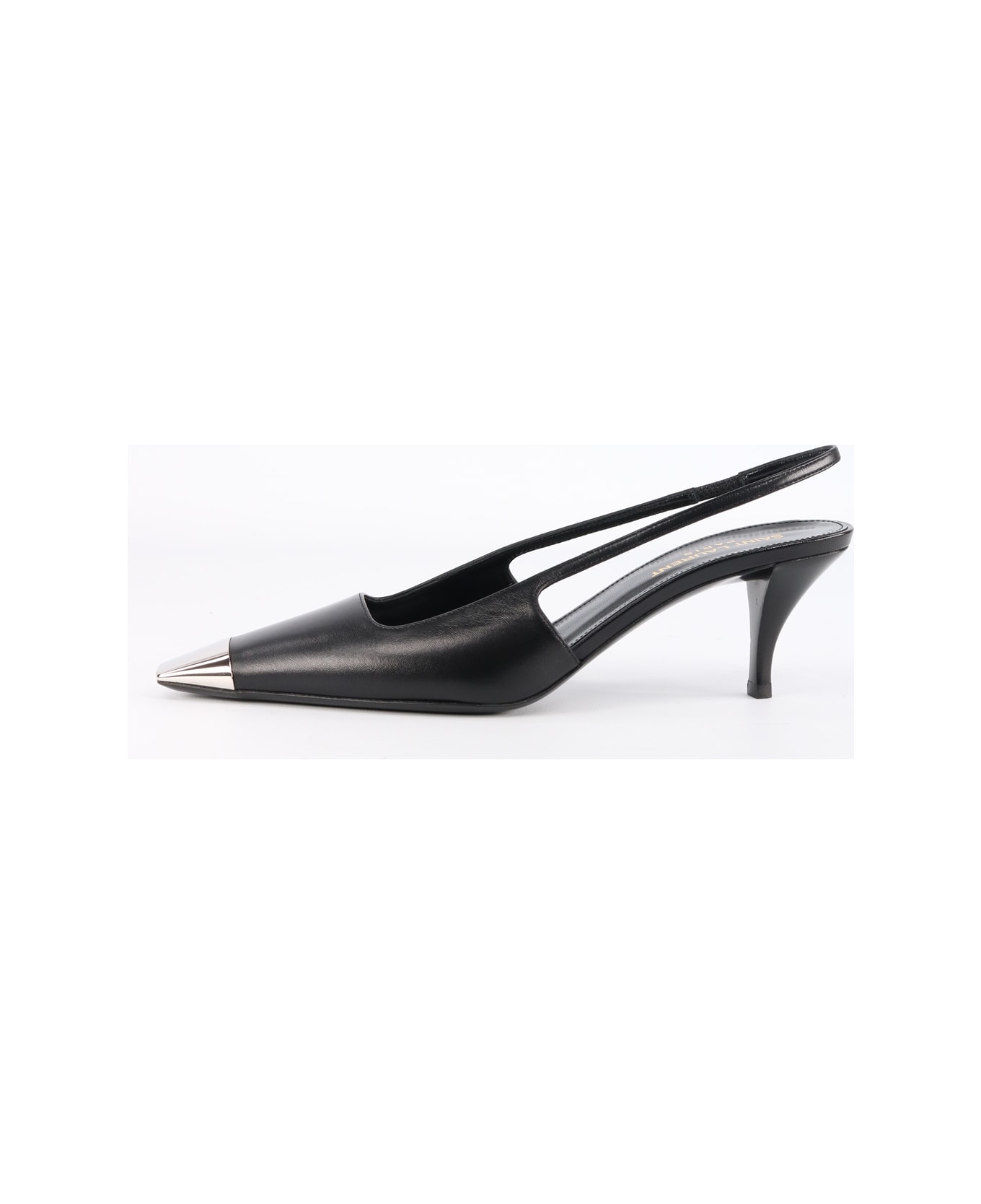 Slingback pumps with setback kitten heel, square cut vamp and elasticized slingback strap, featuring a long, squared pointed toe with metal toe cap. 6 cm heel