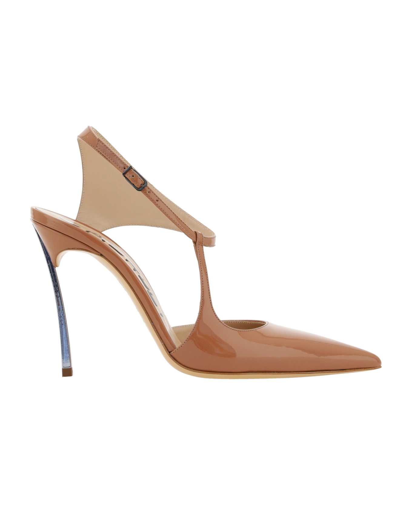 Calfskin super blade melody pumps by casadei, geometric leather stiletto heel, almond toe on front, ankle strap closure, patent leather design, logo-embossed insole. Composition: 100% % Calf Leather Bos Taurus, 100% % Calf Leather Bos Taurus