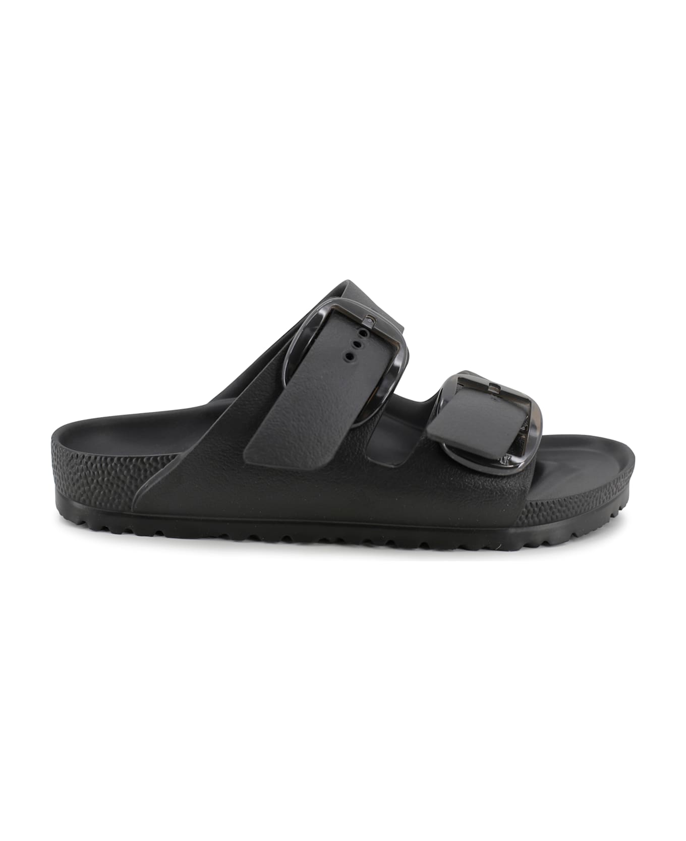 Arizona slide sandals, slip-on design, decorative buckle detail, flat sole.