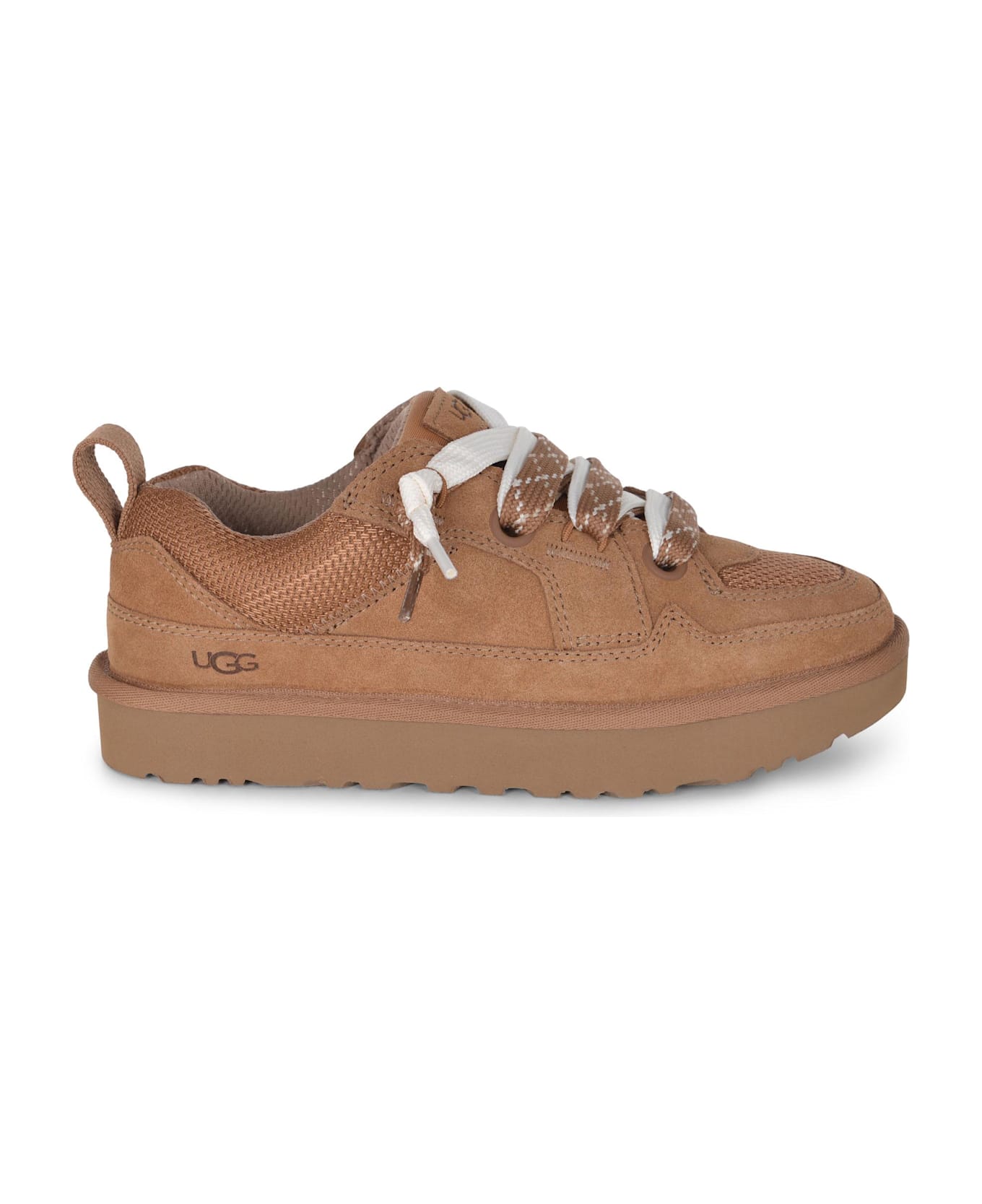 Ugg sneakers made of camel-colored suede. Round toe. Lace-up. Double color laces. Suede and woven canvas mesh upper. Heel strap. Oversized padded tongue with Logo. Contrasting logo lettering engraved on the side. EVA insole EVA sole 100% leather