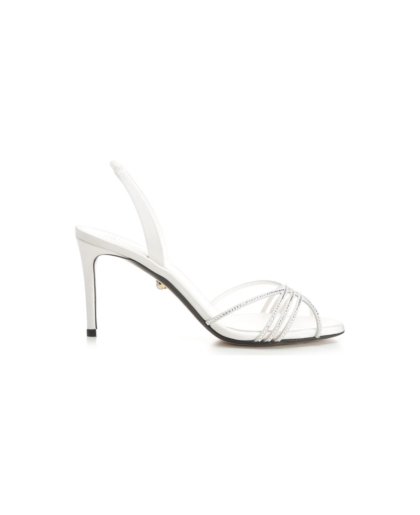 "Giusy" satin sandals with round toe by Alevì. Crossed straps on the upper and decorated with crystals. Elastic slingback strap. 80 mm heels.