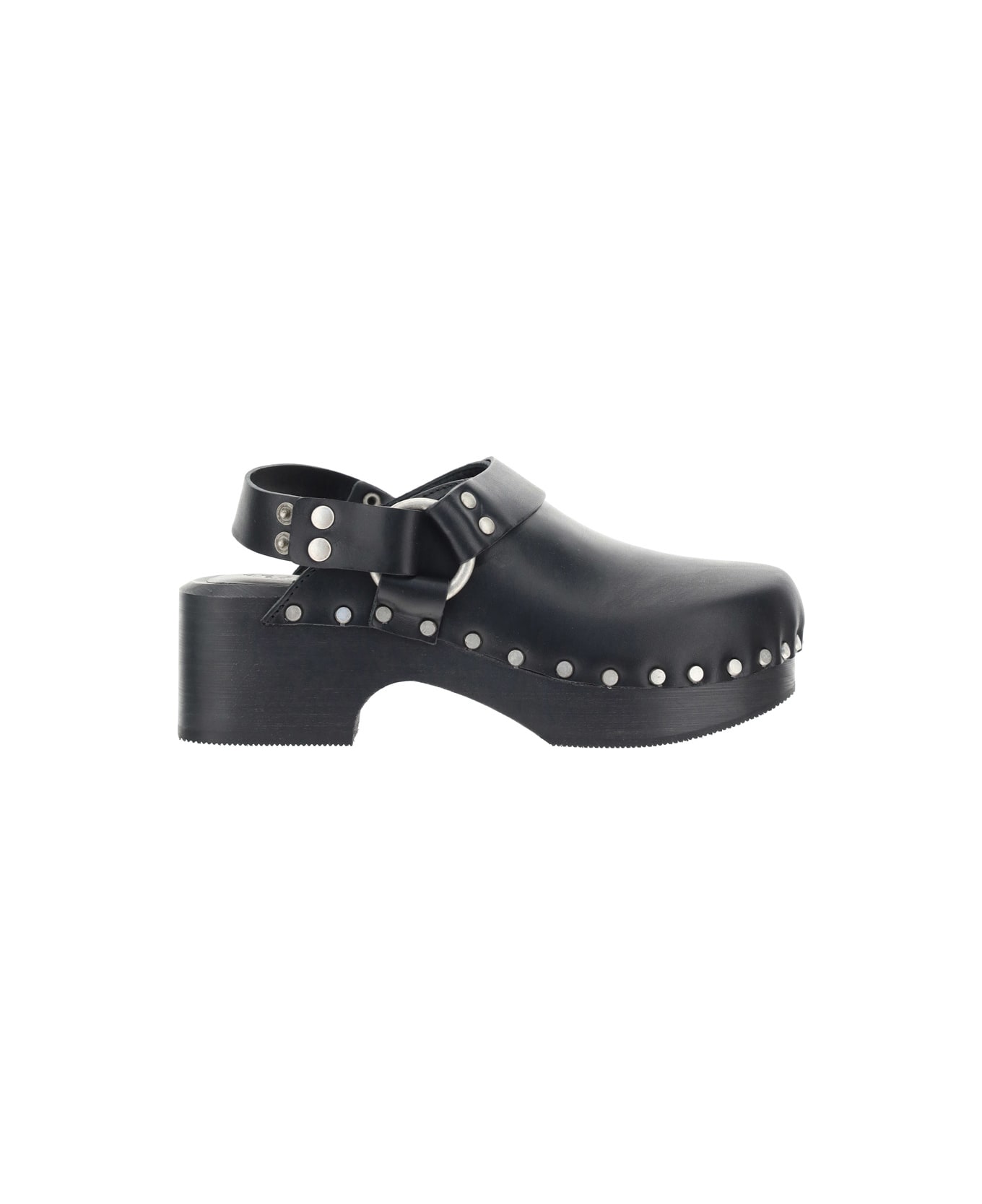 Calfskin 70's clogs by re/done, round toe, leather block heel, clip-on style, leather strap at back of heel with adjustable heel strap, metal studs around upper, cavalry suspender detail on side panels.