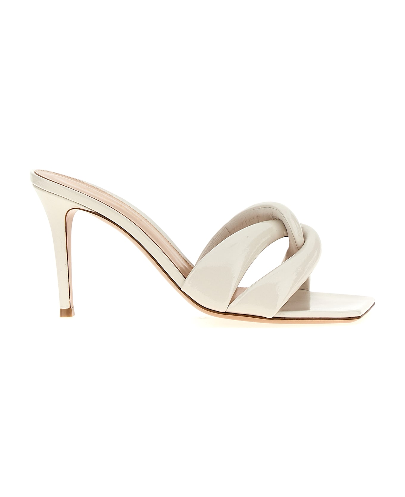 'Amour' mules in shiny leather with front weave, square toe, heel, leather sole.
