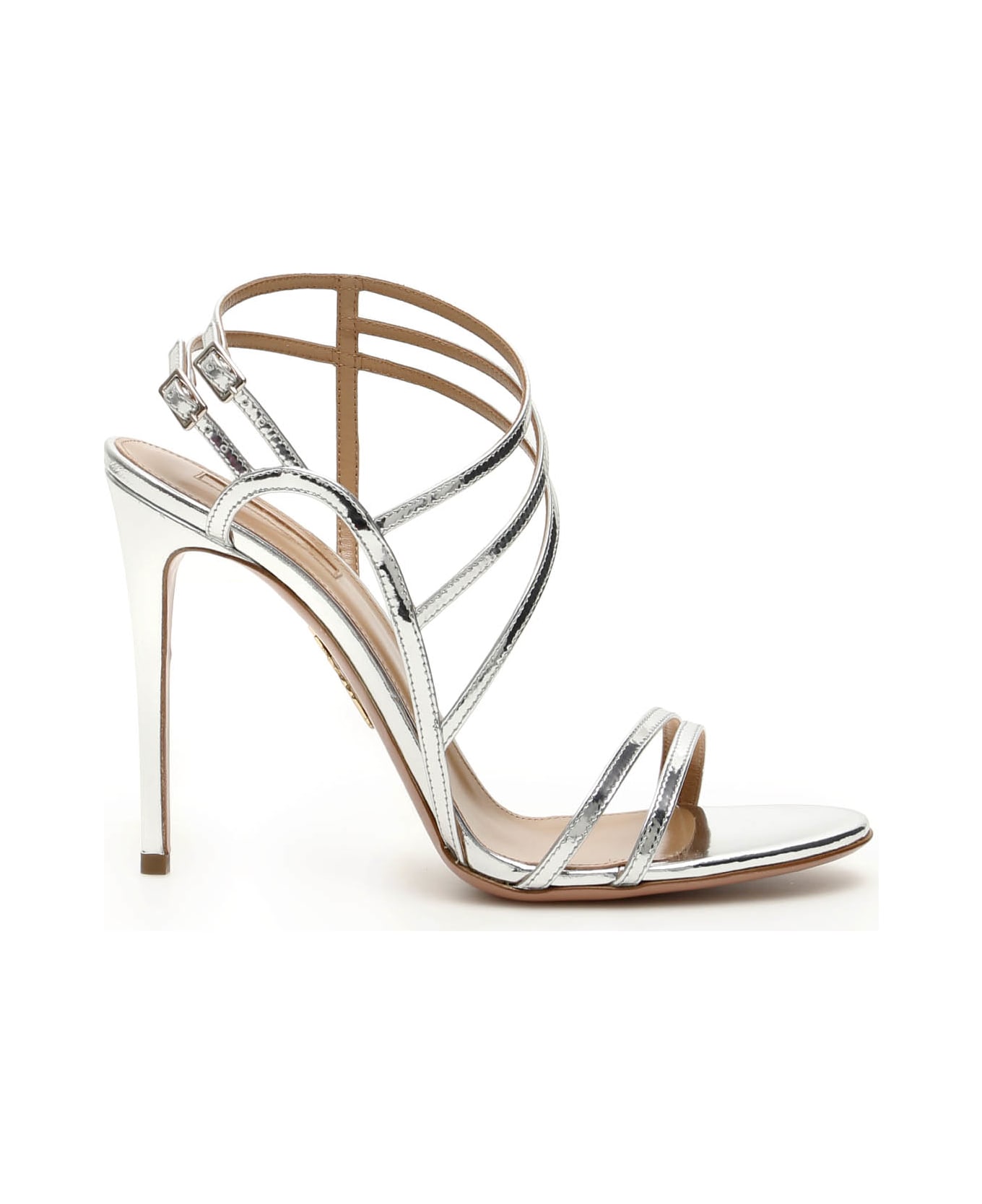 Aquazzurra Spicy sandals in laminated leather, featuring asymmetrical straps and double back straps with steel-tone metal buckles. Leather insole and outsole with iconic golden Pineapple applique. Composition: 100% vitello