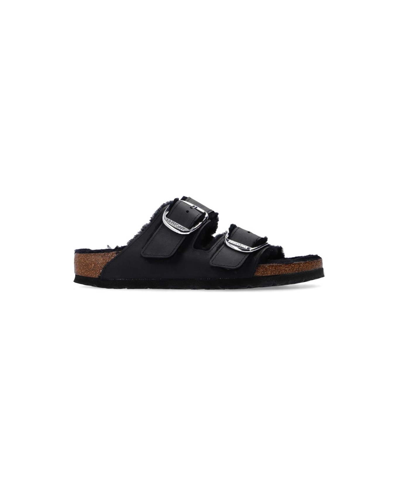 Black 'Arizona Big Buckle Shearling' slides from Birkenstock. Crafted from waxed leather, this pair features straps with a silver-tone logo-embossed buckle and is complete with shearling lining and a sole in brown and black made of cork and EVA foam.