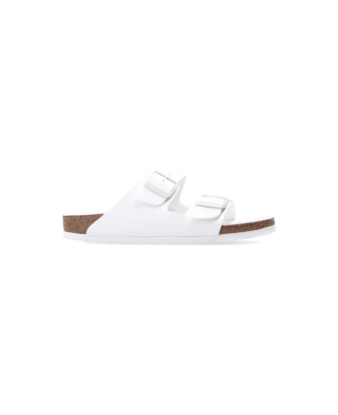 White 'Arizona BS' slides from Birkenstock. Made of Birko-Flor, this design features straps with logo-embossed buckles and a brown and white sole with a cork footbed and EVA foam cushioning.