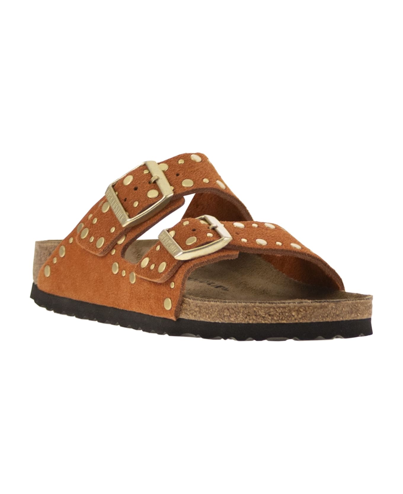 The Birkenstock Arizona sandal wins you over with its excellent fit and very casual, natural design. Contributing to this is the enveloping and particularly soft suede upper, which hugs the foot like a second skin. The comfortable Soft Footbed provides exceptional comfort. This model is finished with studs. - Original Soft Footbed - Upper: suede leather - Insole: suede leather - Outsole: EVA - Details: individually adjustable metal buckles - Narrow fit: Narrower footbed for slim feet DESIGNER ID: 1029513 DARK RUST