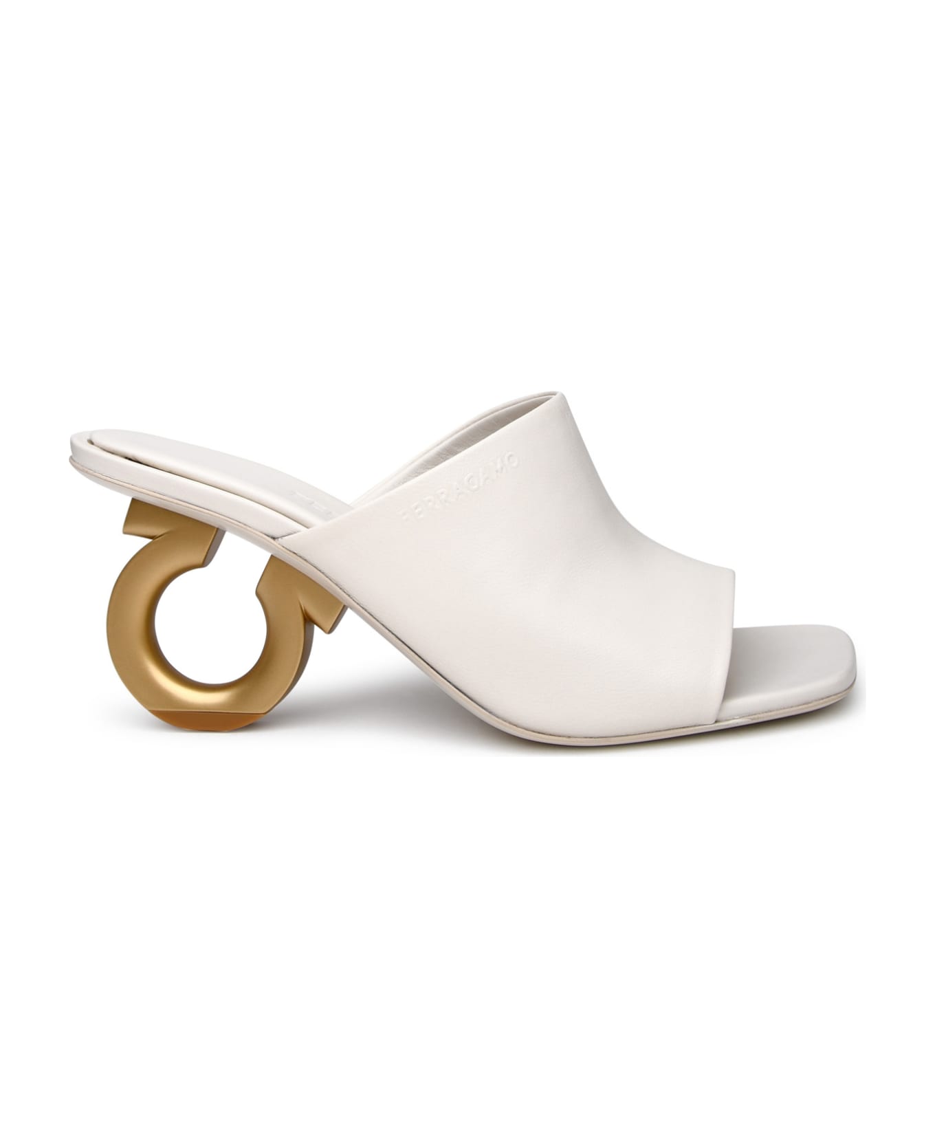 Open toe and wide front band with embossed logo, the Gancini silhouette is transformed into a sculpted heel with rubber detail for better grip \ Heel height: 6 cm Composition: 100% lambskin