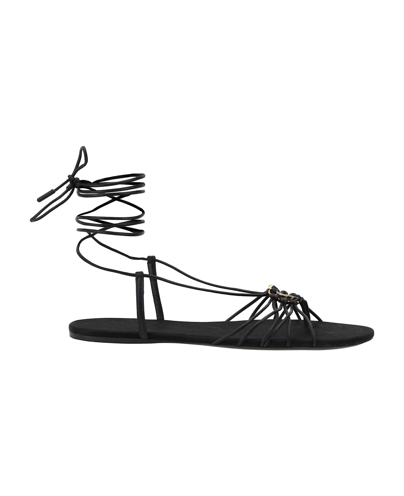 Saint laurent's lambskin babylone sandals are an elegant choice for the summer season. featuring an almond toe, they feature knotted ankle straps for an adjustable fit. the yls plaque on the front adds a distinctive touch, while the flat sole and logoed insole ensure comfort and style. a perfect balance of sophistication and practicality.