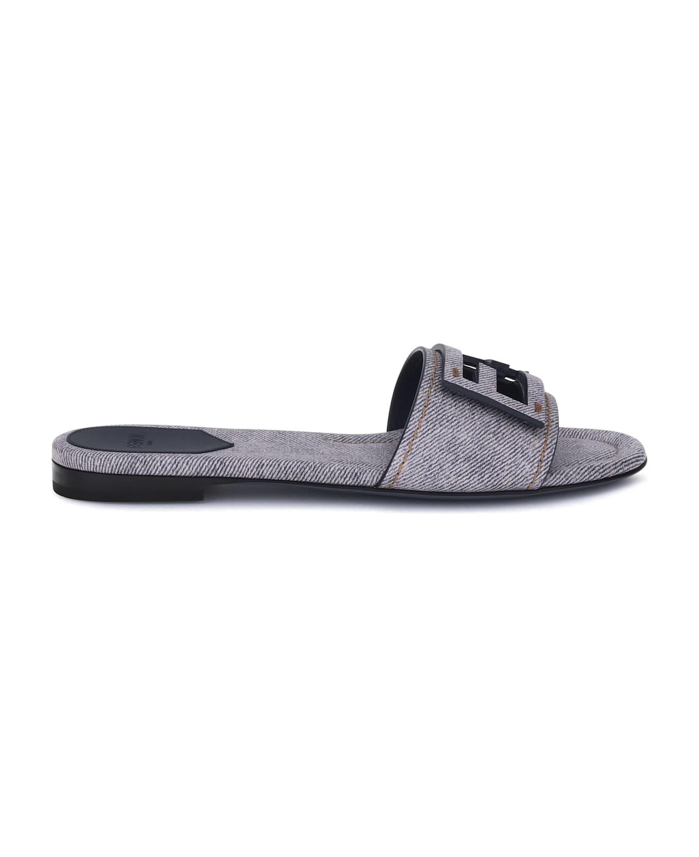 The fendi baguette sandals are a slide model made of denim-effect fabric, finished with contrasting stitching for a touch of character. featuring an almond toe and flat sole, the design is completed by the iconic ff baguette detail on the front, a distinctive symbol of the brand.