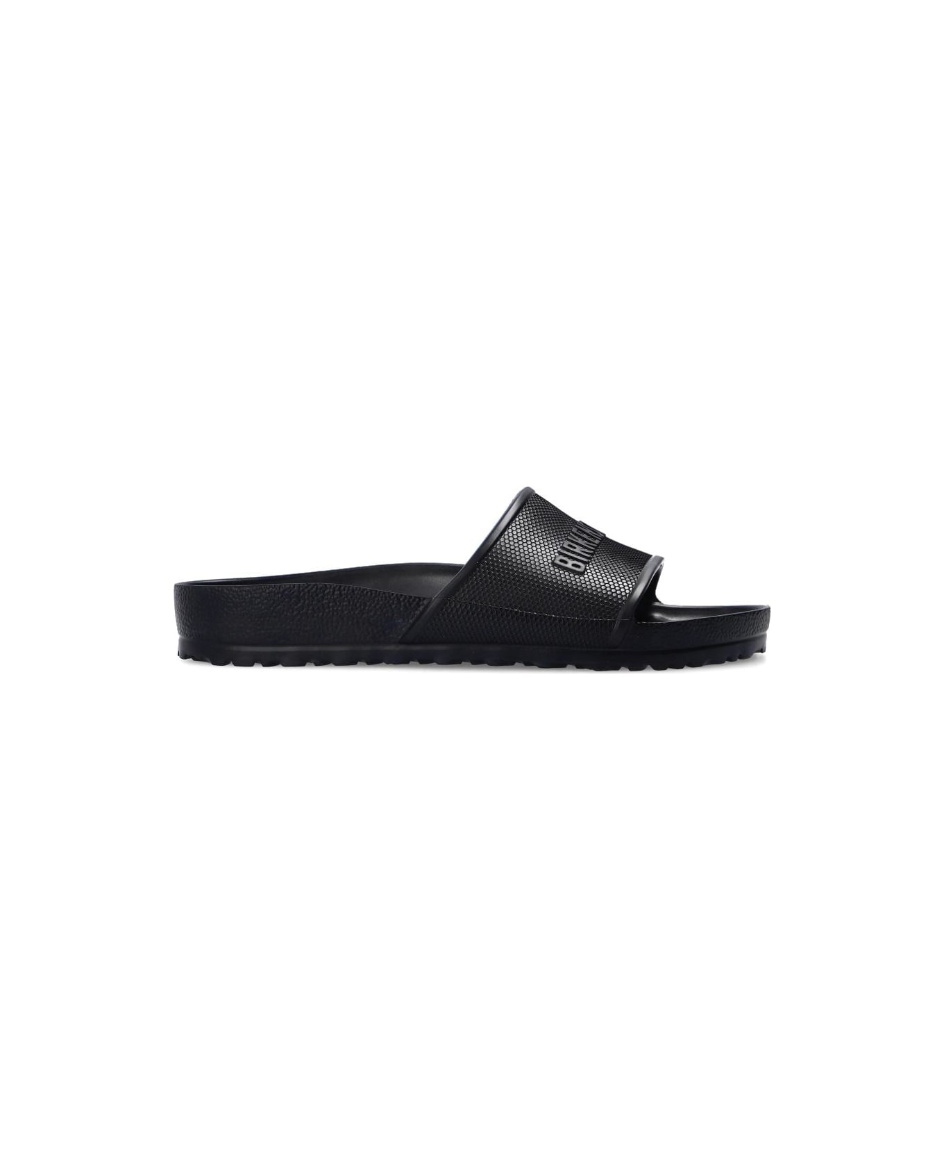 Black 'Barbados EVA' slides from Birkenstock. Made entirely from EVA foam, this pair rests on a black sole and is decorated with a raised logo.