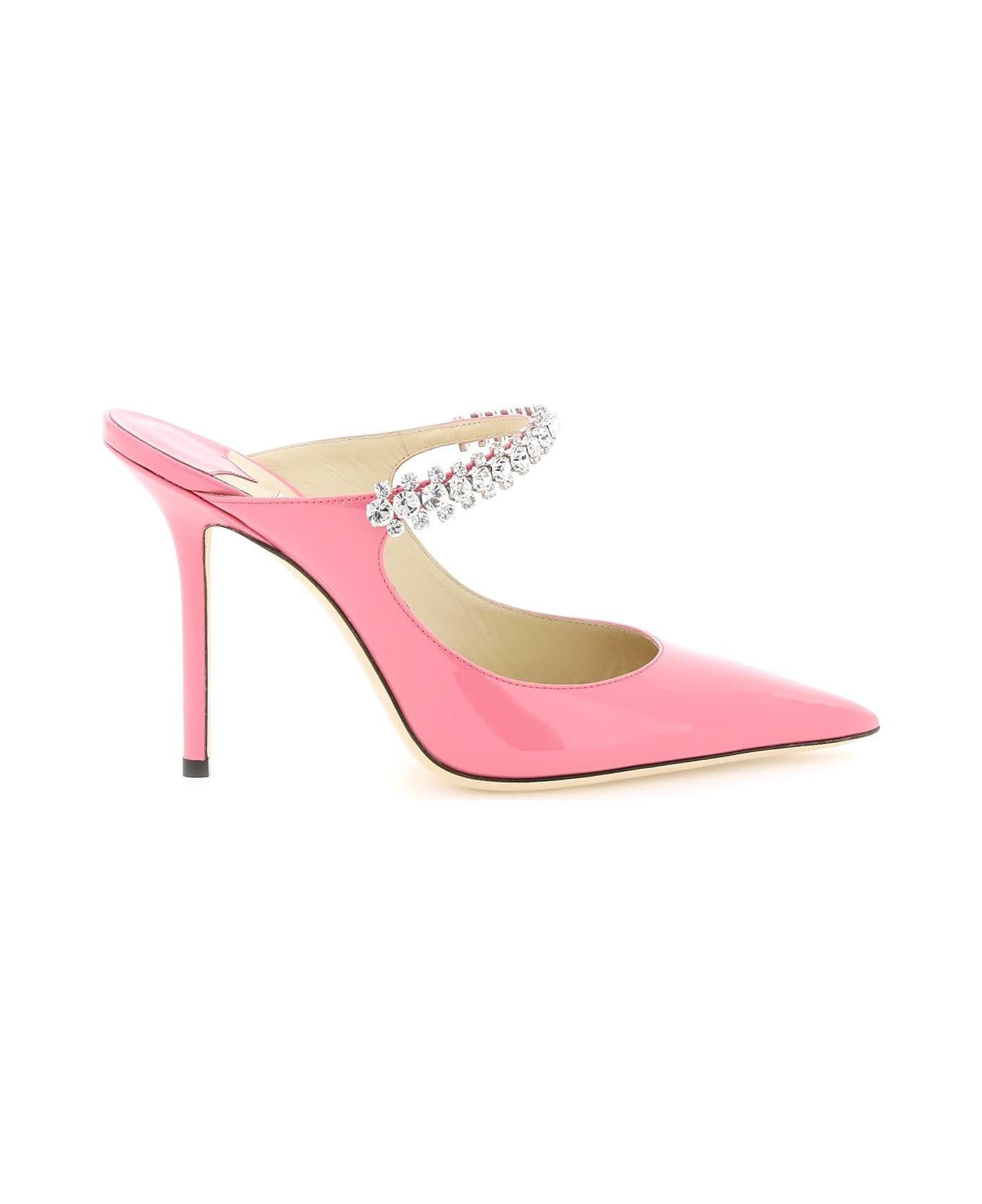 Bing patent mules by Jimmy Choo, decorated with embedded crystals on the front strap. Leather-covered heel, leather lining, leather sole. Composition: 100% calf leather