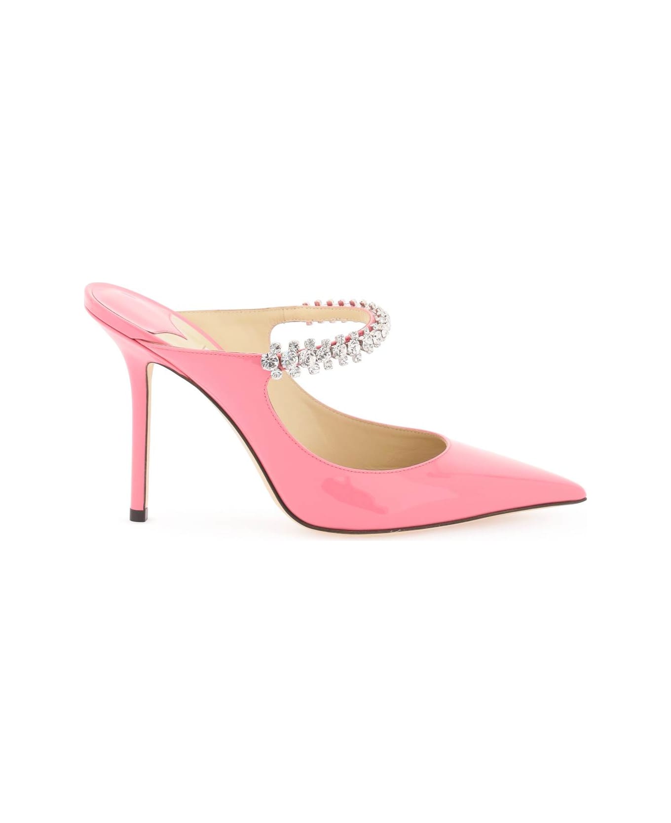 Bing patent mules by Jimmy Choo, decorated with embedded crystals on the front strap. Leather-covered heel, leather lining, leather sole. Composition: 100% calf leather