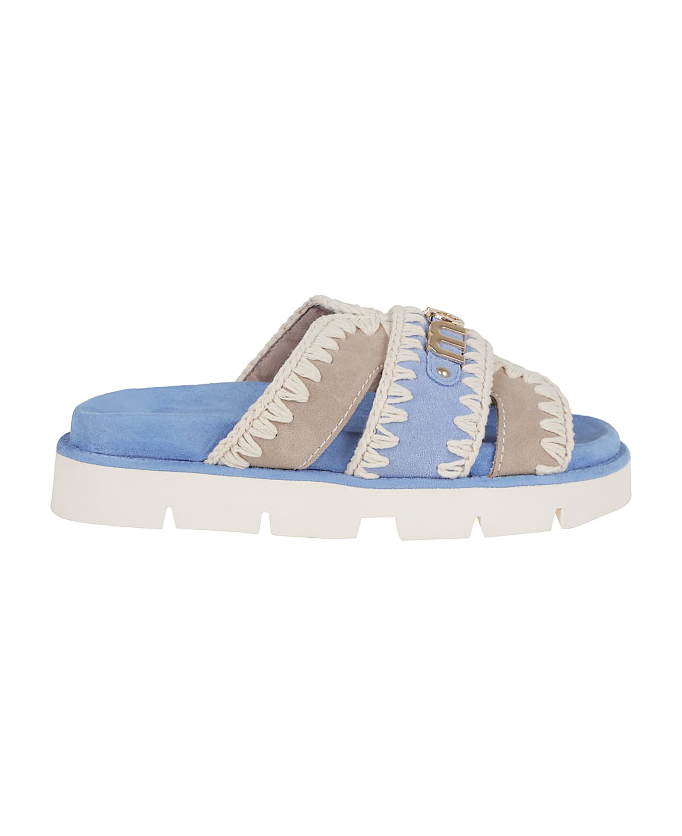 Sandalo Bio sandal bicolor - metal log in two-tone suede leather by MOU. Crossed straps; EVA sole; padded footbed in microsuede Featuring distinctive crochet stitching by mou and metal logo.