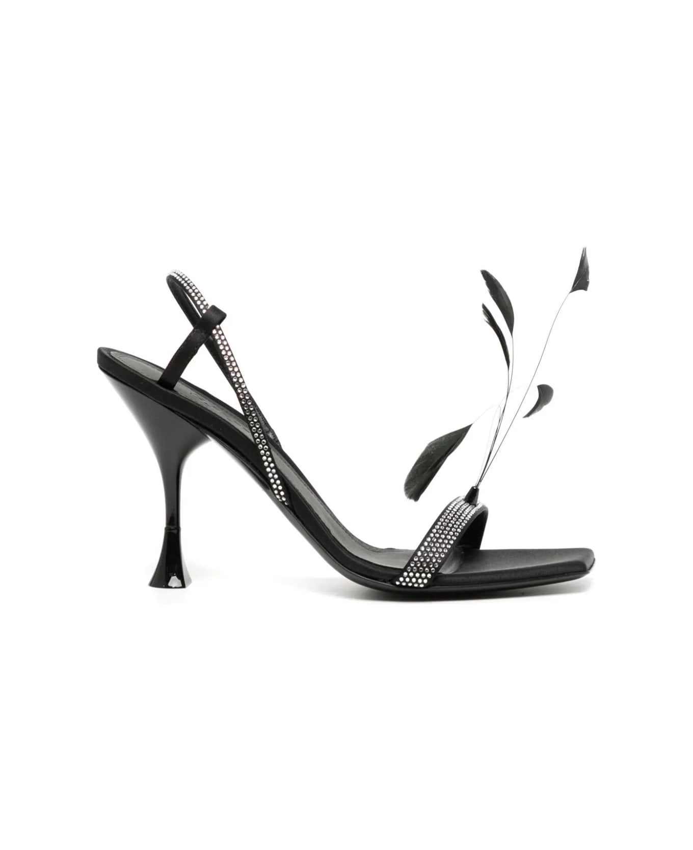 Elettra sandals by 3JUIN made of black leather and embellished with matching feathers and rhinestone application. They feature a square toe, an ankle strap and a comfortable 100 mm high sculptural heel.