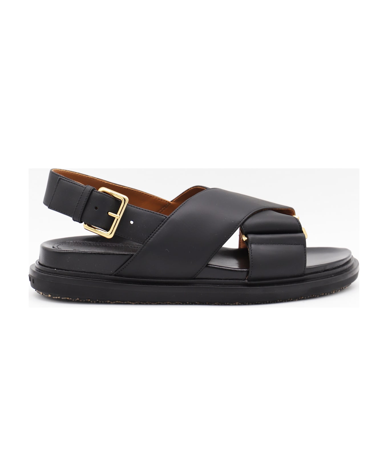 Black leather sandals from Marni featuring round open toe, back buckle fastening, leather sole and logo. Composition: _cover, 100% Le Sole, 100% Elastodiene