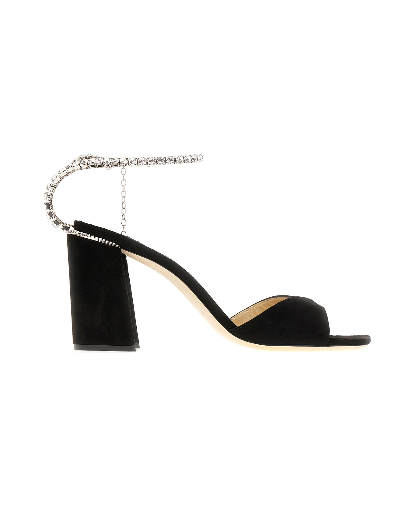 Sandals realized in suede enriched by ankle strap with rhinestones. -Round toe -Thick heel -Contrasting logoed label on the inside Composition: Exterior: 100% Suede Interior: 100% Leather Sole: Leather