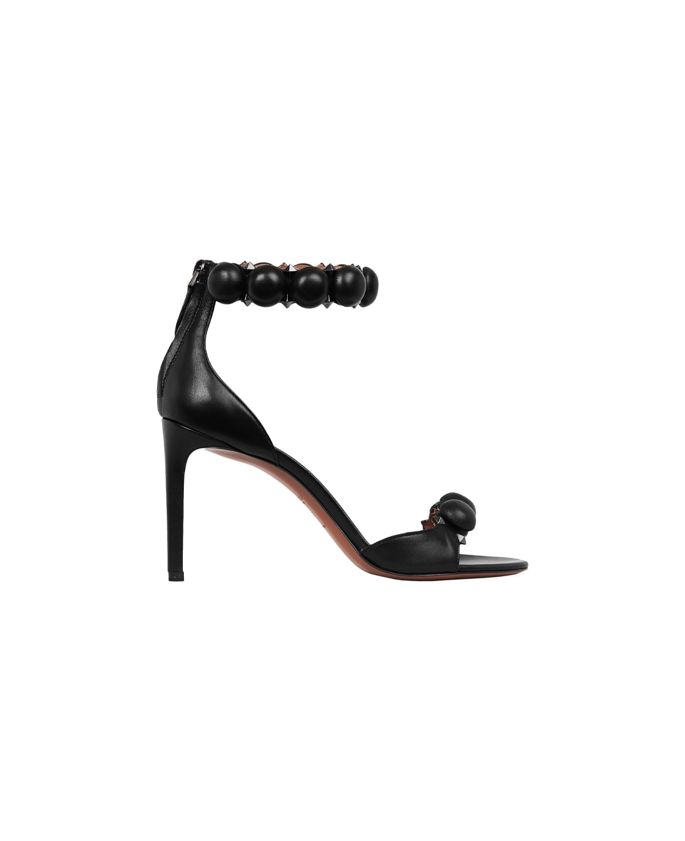 Black Bombe sandal by Alaia made of leather and finished with ankle bracelet, slightly padded insole, zip closure on the back and spherical and pyramidal studs applied by hand.