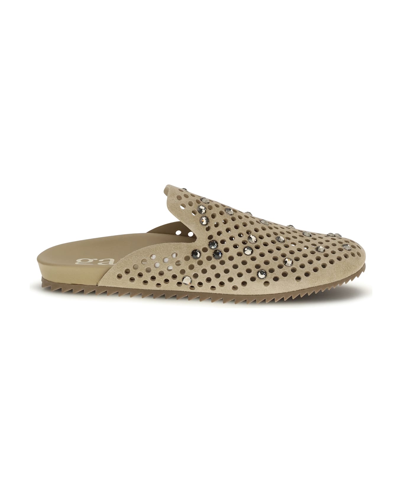 The raidy mules by pedro garcía combine elegance and originality in a sophisticated design. made of suede with perforated workmanship, they are enriched with rhinestones applied on the front that give light and character. the zig-zag sole completes the model with a modern and distinctive touch. Composition: 100% % Calf Leather Bos Taurus