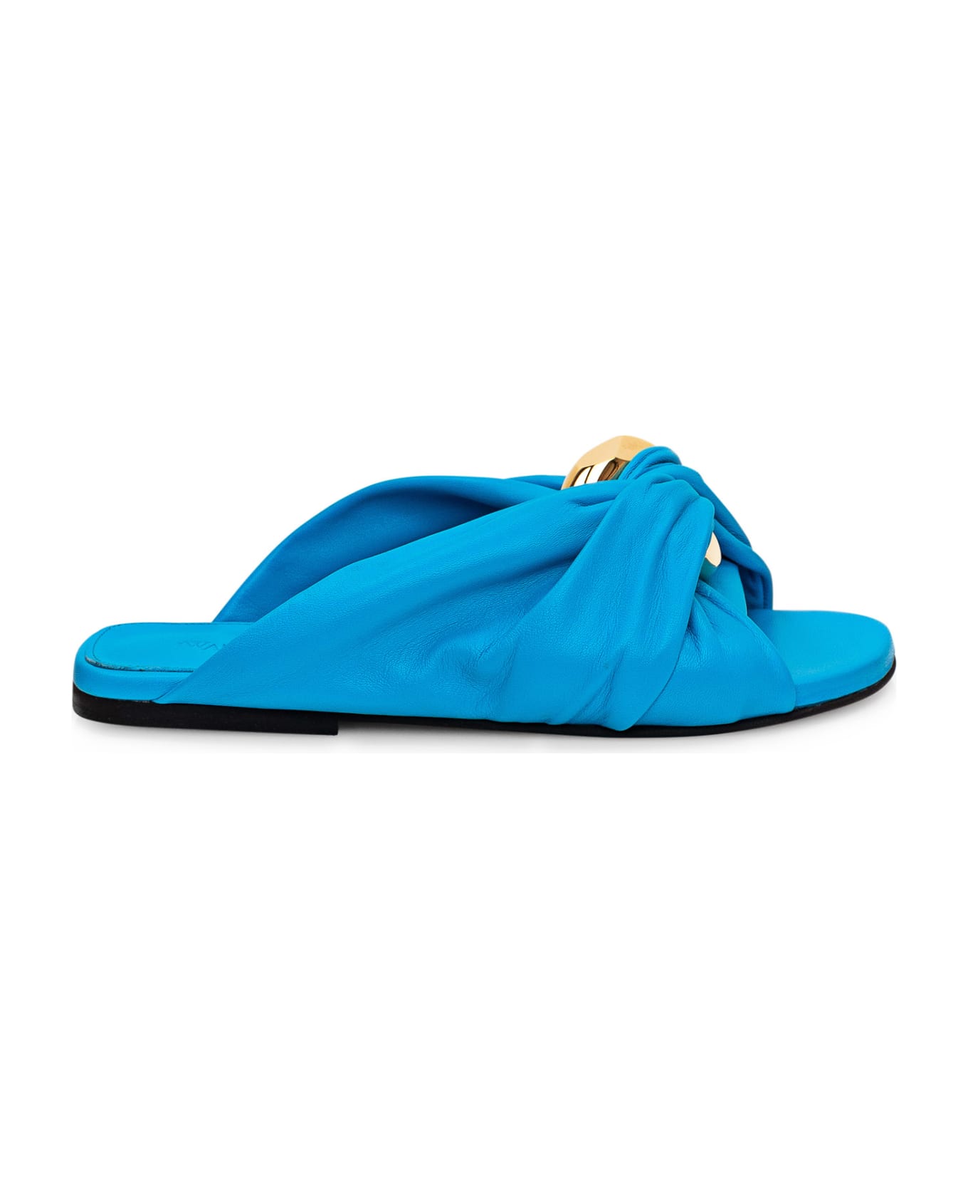 Blue flat sandal. Woven on the front. Golden chain detail. Logo on the sole.