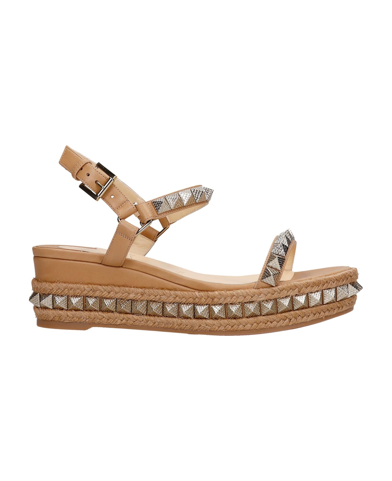 Pyraclou 60 Wedges in beige leather, ankle strap, one strap, open toe, silver studs, low wedge in rope and leather, 70 mm heel, Made in Italy Composition: Leather